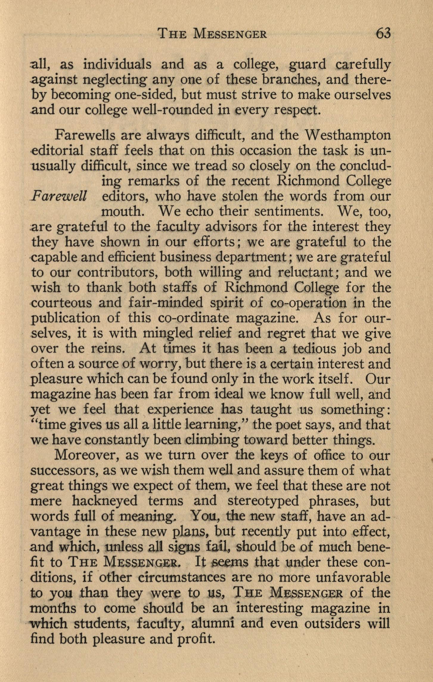 Farewells are always difficult, and the Westhampton -editorial staff feels that on this occasion the task is un·usually difficult, since we tread so closely on the concluding remarks of the recent Richmond College Farewell editors, who have stolen the words from our mouth. We echo their sentiments. We, too, .are grateful to the faculty advisors for the interest they they have shown in our efforts; we are grateful to the -capable and efficient business department; we are grateful to our contributors, both willing and reluctant; and we wish to thank both staffs of Richmond College for the -courteous and fair-minded spirit of co-operation in the publication of this co-ordinate magazine. As for our.selves, it is with mingled relief and regret that we give over the reins. At times it has been a tedious job and often a source of worry, but there is a certain interest and pleasure which can be found only in the work itself. Our magazine has been far from ideal we know full well, and yet we feel that experience has taught us something: "time gives us all a little learning," the poet says, and that we have constantly been climbing toward better things.