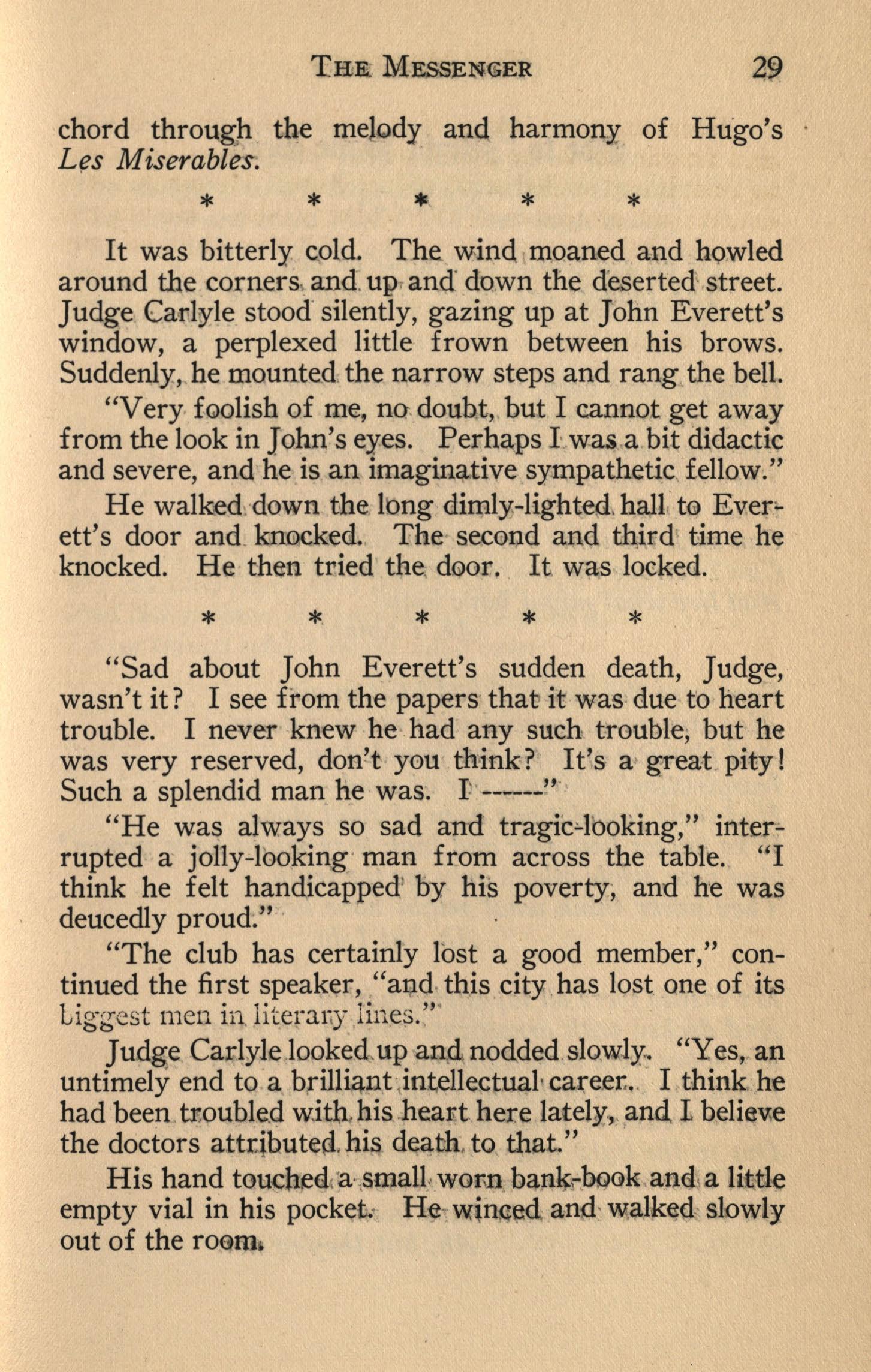 It was bitterly cold. The. wind moaned and h9wled around the corners , and . up , and · down the deserted · street. Judge Carlyle stood· silently , gazing up at John Everett's window, a perplexed little frown between his brows. Suddenly, he mounted . the narrow steps and rang the bell.