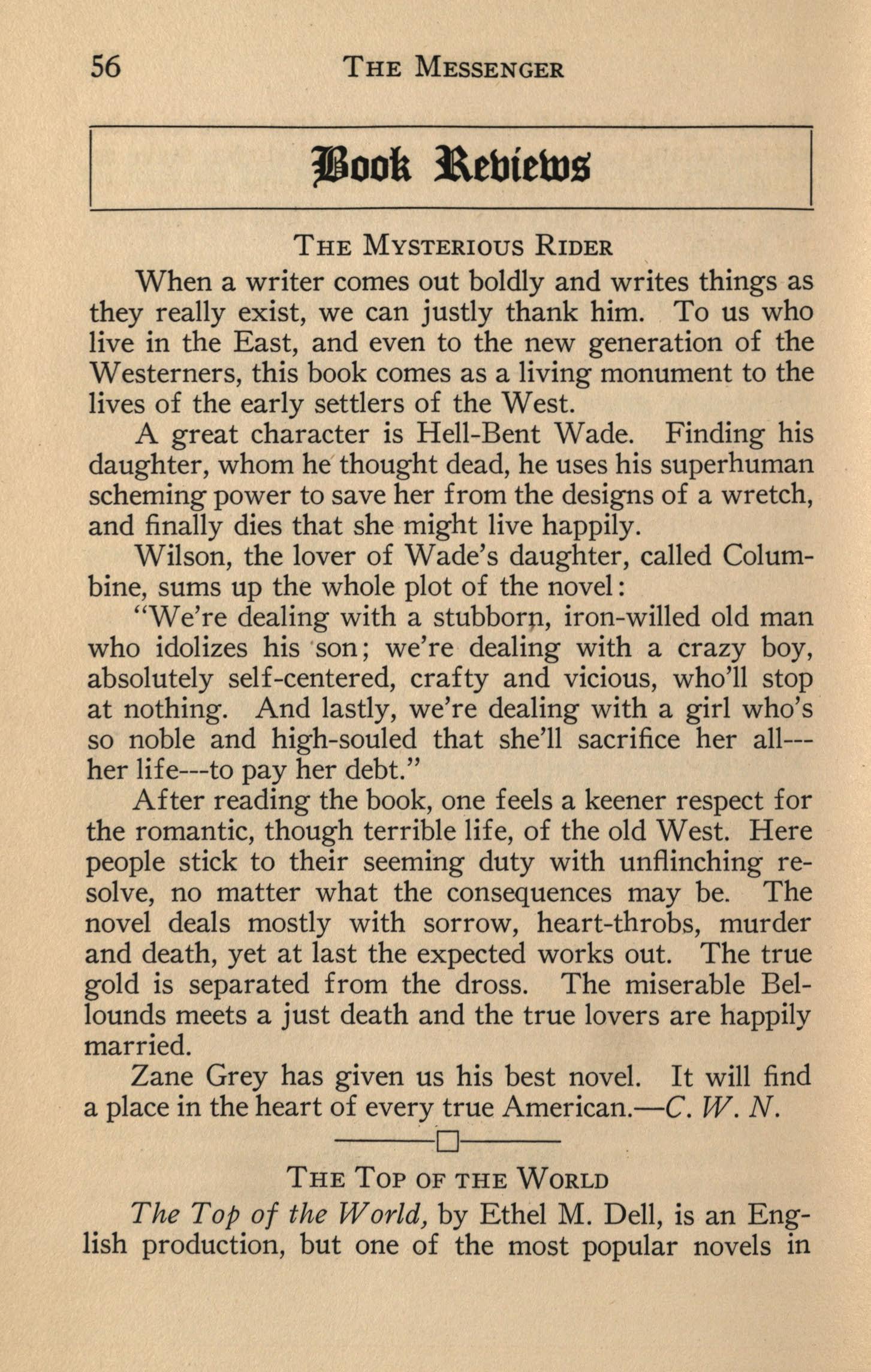 Sylvia is impulsive but courageous and able to fit in under any conditions, which makes her an admirable -character. Burke is capable of being hard and masterful, but is all love and generosity towards the heroine, while Guy is characterized by his weakness, but has a keen sense of honor. The humanity of the characters wins the reader's swift appreciation. Persons liking a romantic love story will enjoy reading The Top of the World. -0. K. B.