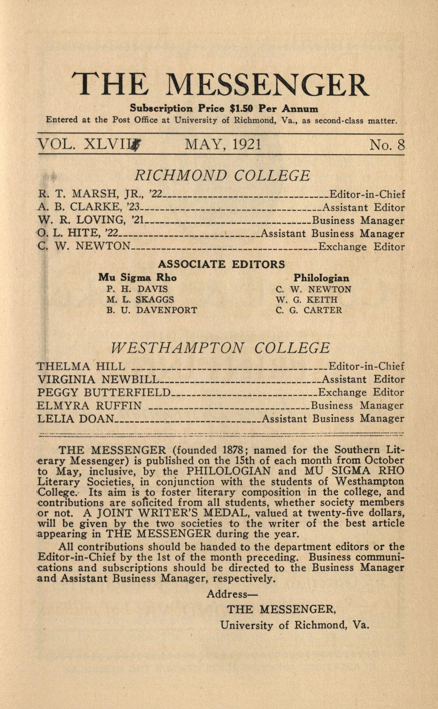 THE MESSENGER (founded 1878; named for the Southern Lit-erary Messenger) is pub'lished on the 15th of each month from October to May, inclusive, by the PHILOLOGIAN and MU SIGMA RHO Literary Societies, in conjunction with the students of Westhampton College. · Its aim is to foster literary composition in the college, and contributions are so1'icited from all students, whether society members or not. A JOINT WRITER'S MEDAL, valued at twenty-five dollars, will be given by the two societies to the writer of the best article .appearing in THE MESSENGER during the year.