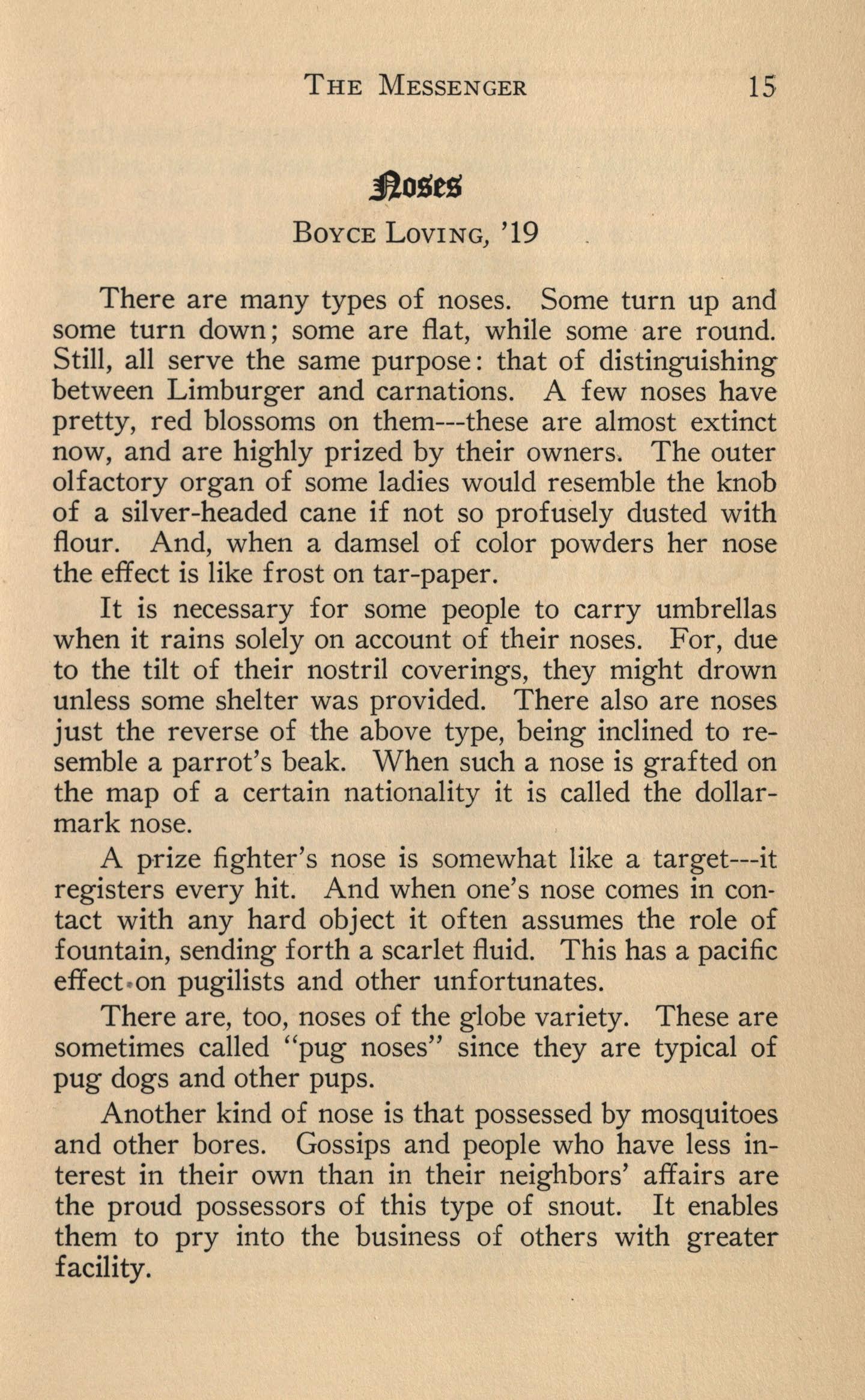 There are many types of noses. Some turn up and some turn down; some are flat, while some are round. Still, all serve the same purpose: that of distinguishing between Limburger and carnations. A few noses have pretty, red blossoms on them---these are almost extinct now, and are highly prized by their owners. The outer olfactory organ of some ladies would resemble the knob of a silver-headed cane if not so profusely dusted with flour. And, when a damsel of color powders her nose the effect is like frost on tar-paper.