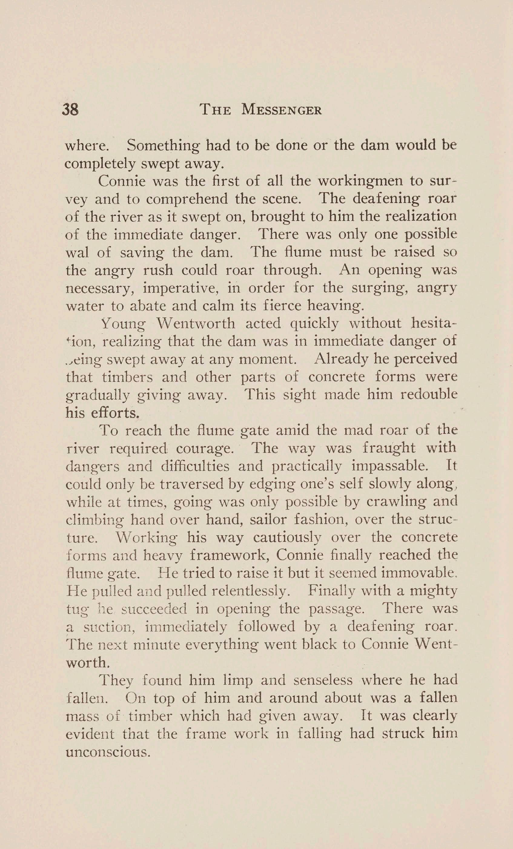 In almost an instant, Red had awakened the people. All was in the greatest confusion. There were the cries of children and the shrieks of frightened women. Above the uproar, the voice of the men shouting hasty directions could be faintly heard. After the first panic was over, Red thought of the girl alone in her third floor room . He fought his way to her room, and found her at the door wrapped in a cloud of thick smoke. With great difficulty, he succeeded in getting her to the fire escape wher she could make her way alone to the ground.