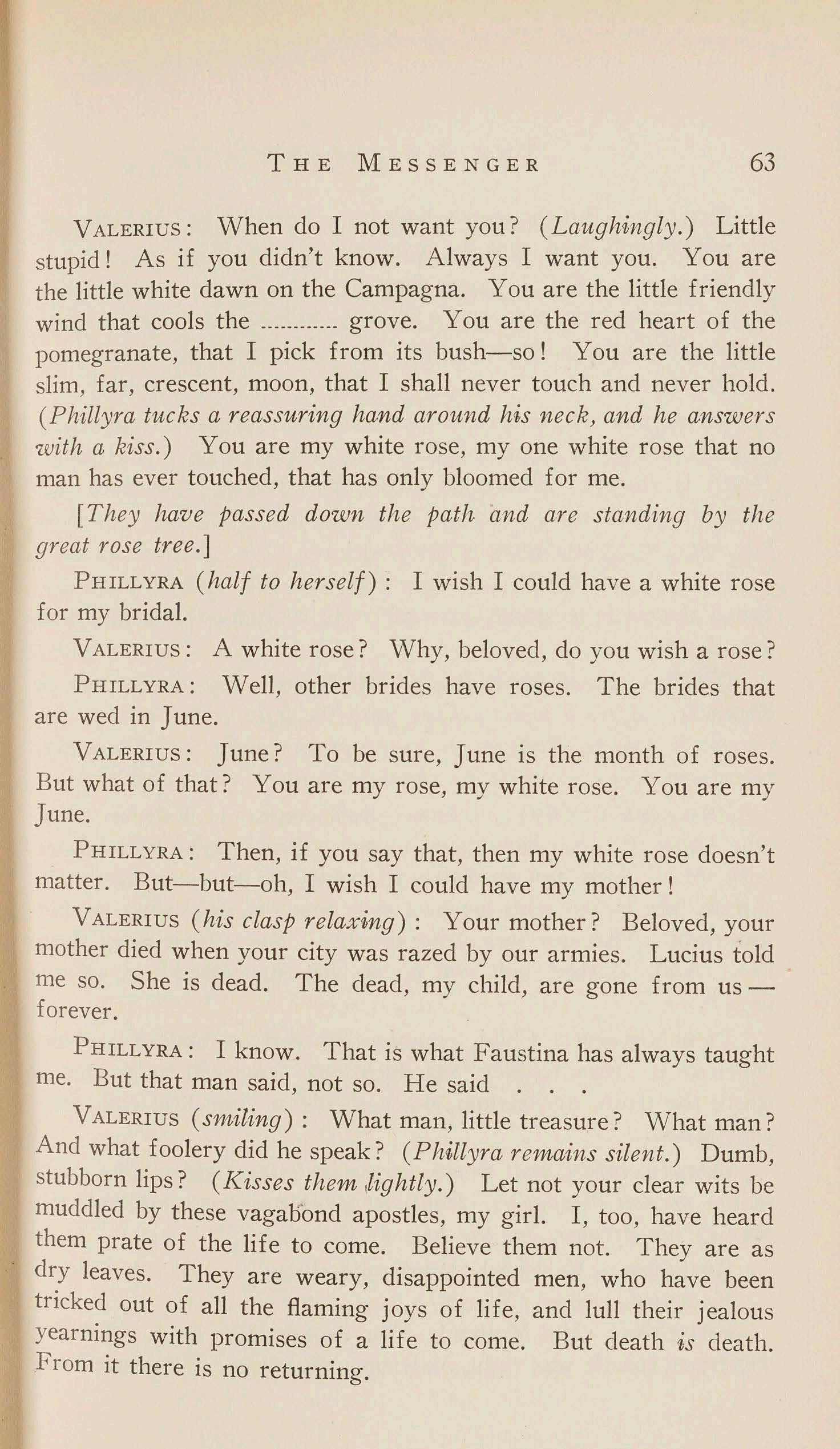 VALERIUS: When do I not want you? ( Laitghingly.) Little stupid! As if you didn't know. Always I want you. You are the little white dawn on the Campagna. You are the little friendly wind that cools the ............ grove. You are the red heart of the pomegranate, that I pick from its bush-so! You are the little slim, far, crescent, moon, that I shall never touch and never hold. (Phillyra tucks a reassuring hand around his neck, and he answers with a kiss.) You are my white rose, my one white rose that no man has ever touched, that has only bloomed for me.