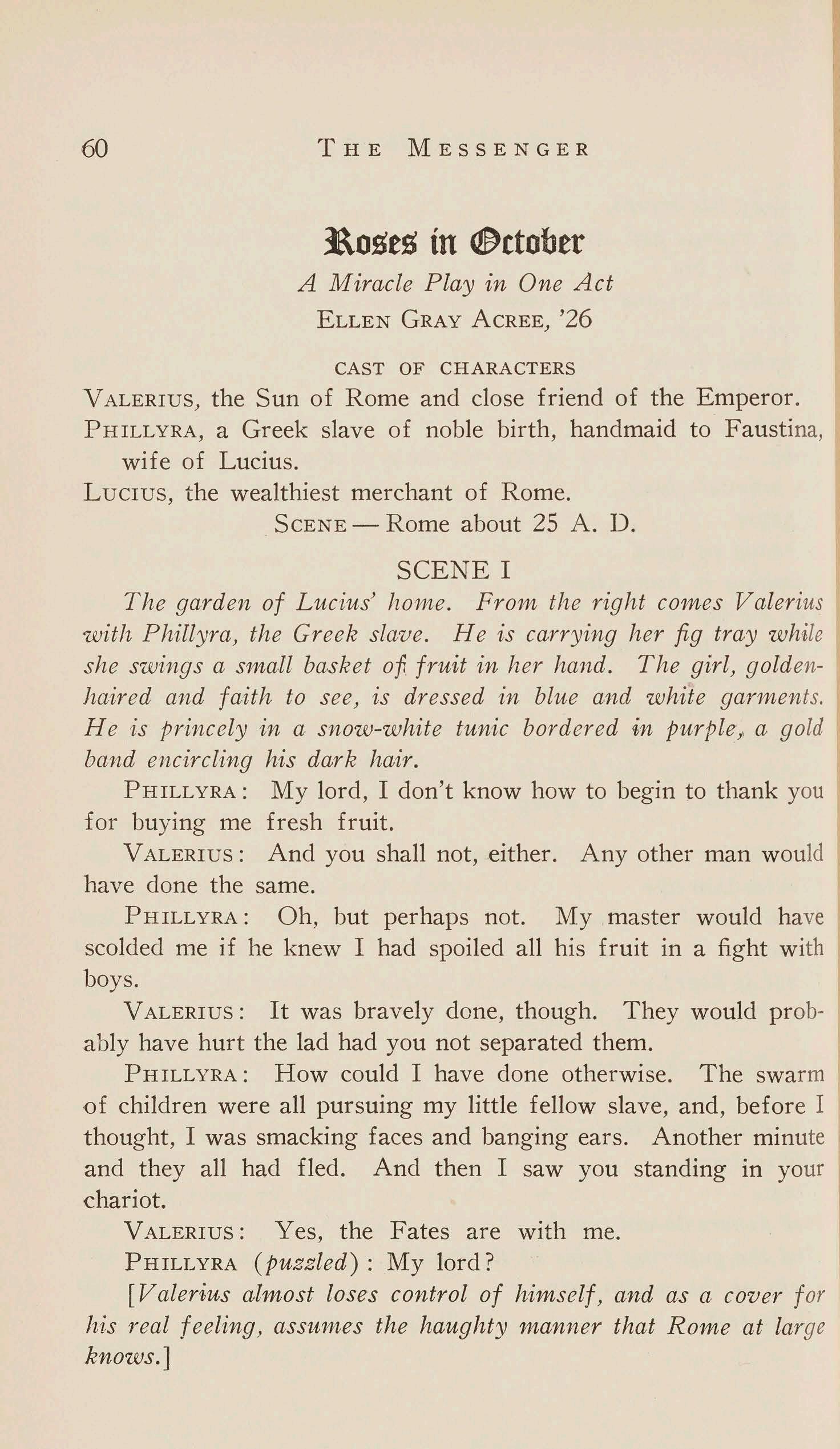 The garden of Lucius the night before Phillyra' s wedding. It is late in October, the blue mists hang thief? over the wide sw eep · of Campagna. A .tall rose bush is to the left. It is a rare, magnificent shrub, almost a tree, and it is the pride of Lucius' heart. Every spring it is a drift of beauty, but now it bears not one solitary bud. The shrub is a mass of dusky green.