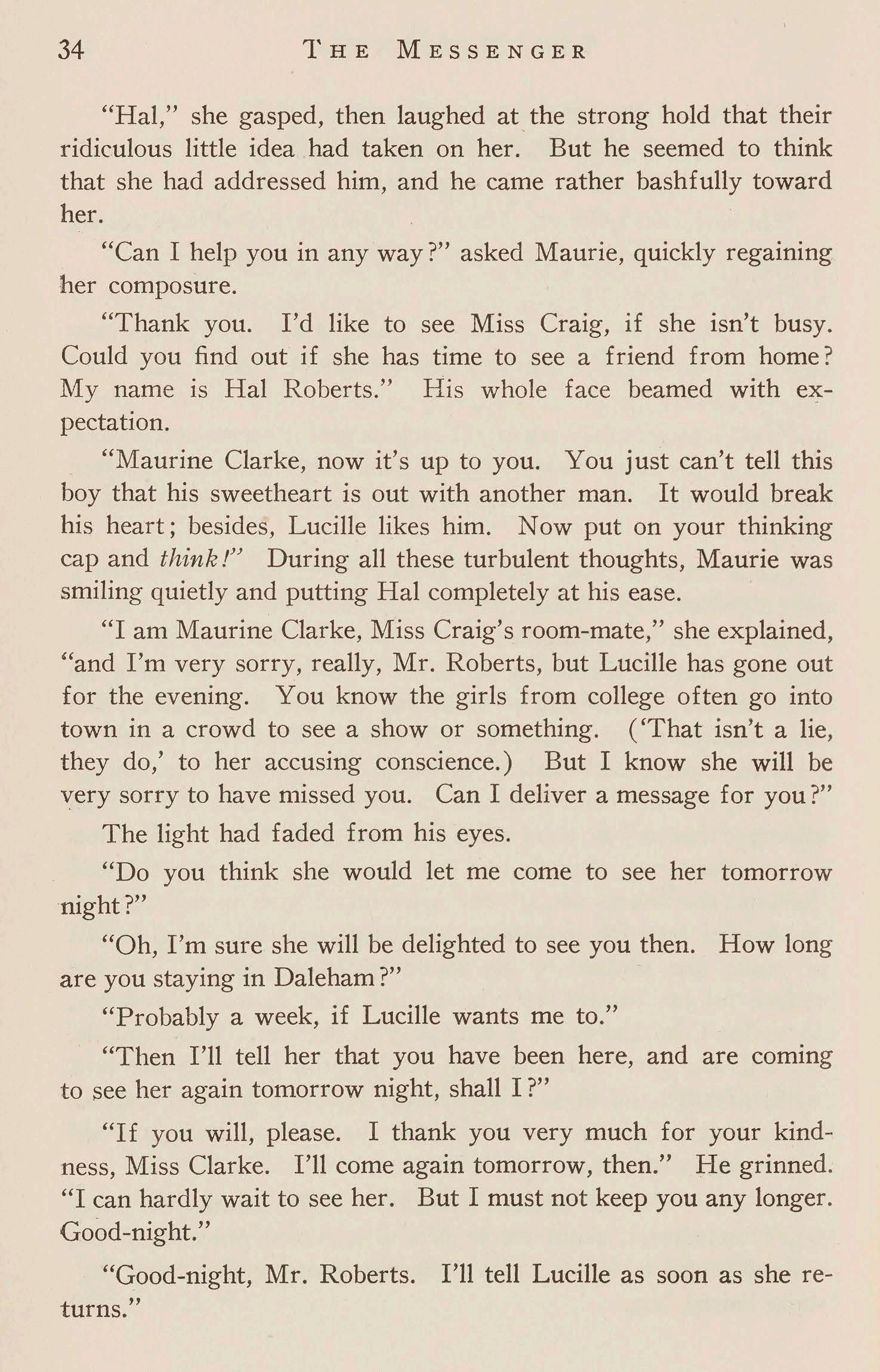 "Well, naturally I am always glad to see my little cousin, but when that little cousin continually writes to me of her lovely roommate , I am rather interested, and when she gives me a picture o f this little brown-eyed lady, I am seized with a desire to visit Daleham ." He laughed a low, happy laugh. "Lucille and Hal hav e been engaged for months. Hal was in on the joke , too ." A ga y burst of laughter and the sudden appearance of Hal and Lucill e confirmed his story . Maurie wildly glanced about to find a plac e to hide her confused blushes -and Ed helped her out.