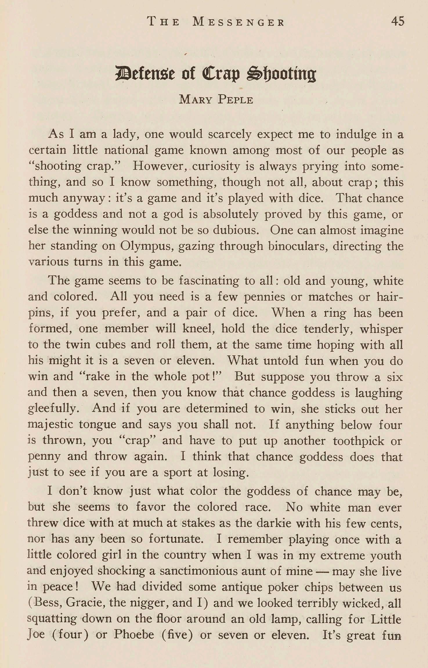 I don't know just what color the goddess of chance may be, but she seems to favor the colored race. No white man ever t hrew dice with at much at stakes as the darkie with his few cents, n or has any been so fortunate. I remember playing once with a little colored girl in the country when I was in my extreme youth and enjoyed shocking a sanctimonious aunt of mine-may she live in peace ! We had divided some antique poker chips between us ( Bess, Gracie, the nigger, and I) and we looked terribly wicked, all squatting down on the floor around an old lamp, calling for Little J oe (four) or Phoebe (five) or seven or eleven. It's great fun