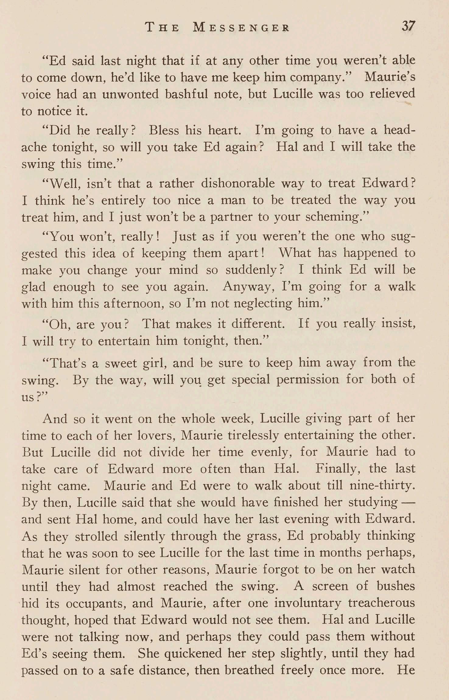 And so it went on the whole week, Lucille giving part of her time to each of her lovers, Maurie tirelessly entertaining the other. But Lucille did not divide her time evenly, for Maurie had to take care of Edward more often than Hal. Finally, the last night came. Maurie and Ed were to walk about till nine-thirty. By then, Lucille said that she would have finished her studyingand sent Hal home , and could have her last evening with Edward. As they strolled silently through the grass, Ed probably thinking that he was soon to see Lucille for the last time in months perhaps, Maurie silent for other reasons, Maurie forgot to be on her watch until they had almost reached the swing. A screen of bushes hid its occupants, and Maurie, after one involuntary treacherous thought, hoped that Edward would not see them. Hal and Lucille were not talking now, and perhaps they could pass them without Ed's seeing them. She quickened her step slightly, until they had passed on to a safe distance, then breathed freely once more. He
