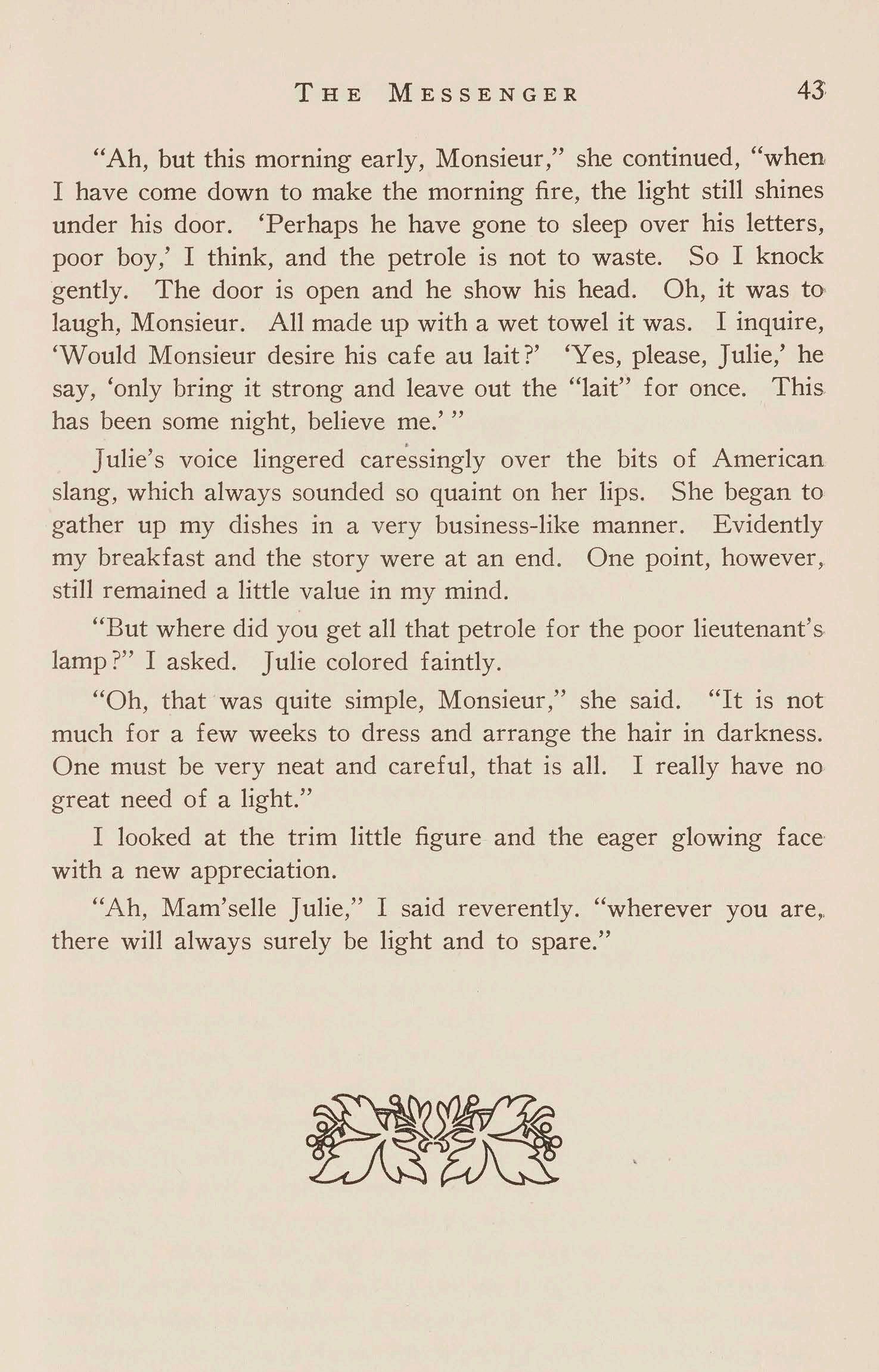 I was late in getting down to breakfast that morning. In fa ct Julie was bustling about arranging the tables in readiness for "d e jeuner." When I had seated myself at my favorite table by th e window with its screen of trailing vines, she brought in my "ca£ e au lait," and slyly produced a couple of lumps of the fo rbidden sugar. Leaning gracefully against the nearby window sill with a glint of the sun on her shining hair, she waited in friendl y fashion as if to bear me company during my lonely meal. She wa s a bright, serious little thing, and had picked up an amazing lot of English which she loved to air upon us, and we humored her an d ourselves by refusing to speak French in her presence.