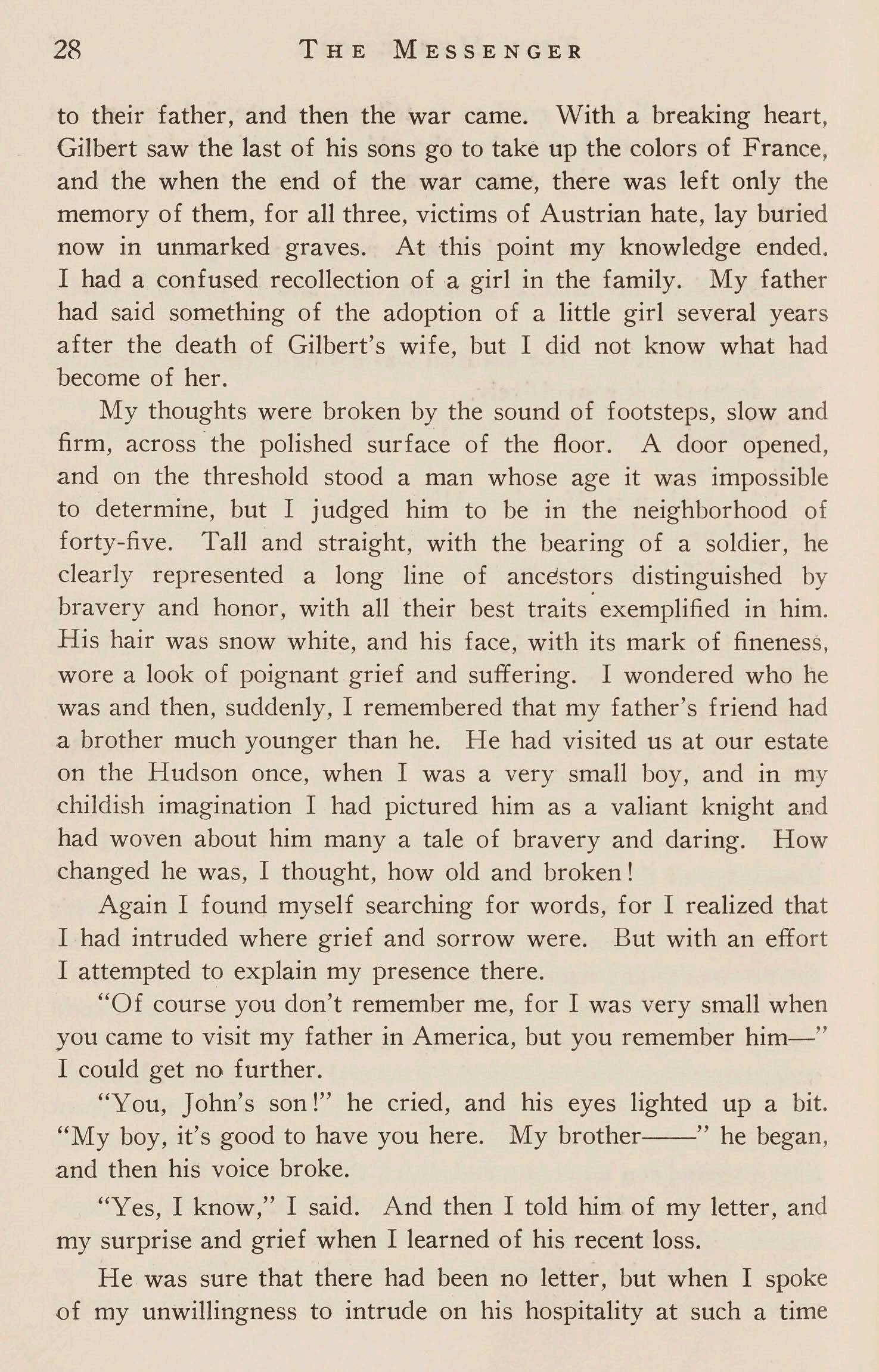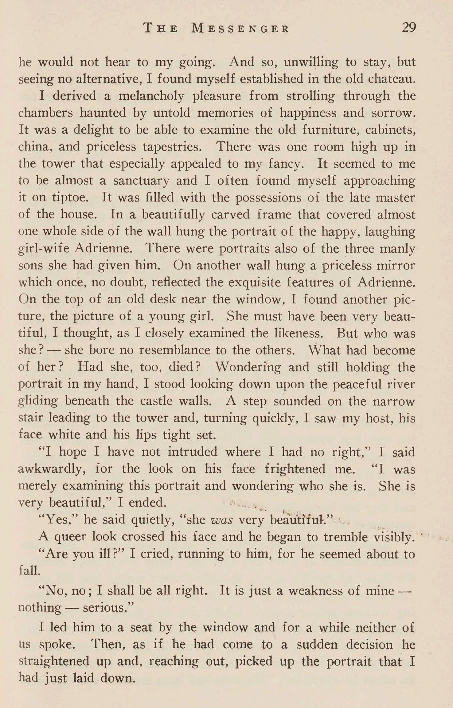 As I made my way slowly up an embankment toward one of these castles, I looked about me for some sign of life, but there were none visible. Feeling as if I were intruding in some sacred temple where I had no right, I hesitated a moment before the massiv e walls. Then, uniting all my strength, I pushed with my whole body against the great iron gates. After a moment's resistance , they yielded reluctantly and I found myself within the walls that guarded the chateau of my father's friend. It seemed like hour s before an old servant came to answer my knocking. He peered at me quizzically with his little searching eyes, paused uncertaintly for a moment, and then bade me enter. Thinking to relieve the old man as to my identity, I held out my card. He stared at it blankly and made no move to take it to his master. A little surprised that Monsieur Michelet had not informed him of my coming, for I had written a fortnight ago from Paris, I was at a loss how to begin.