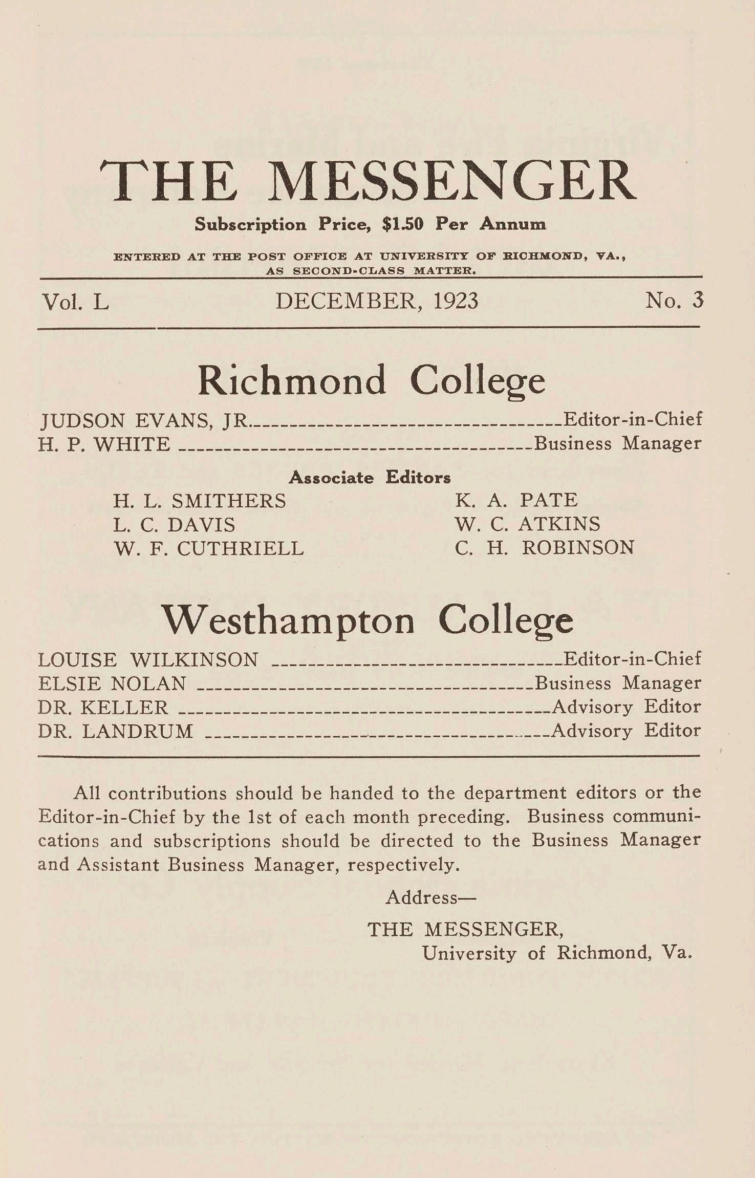 All contributions should be handed to the department editors or the Editor-in-Chief by the !st of each month preceding. Business communications and subscriptions should be directed to the Business Manager an d Assistant Business Manager, respectively.