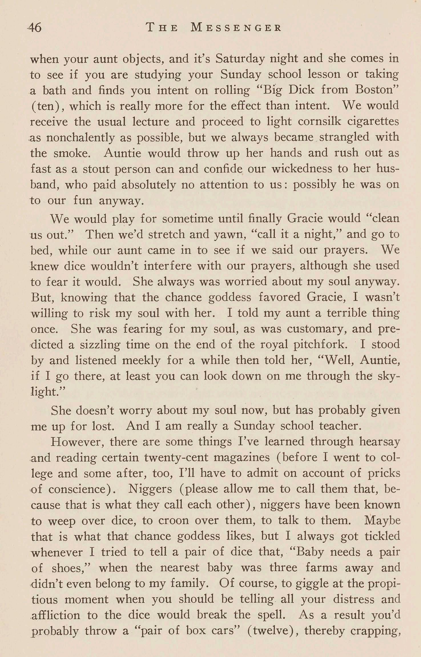 She doesn't worry about my soul now, but has probably given me up for lost. And I am really a Sunday school teacher. However, there are some things I've learned through hearsay and reading certain twenty-cent magazines (before I went to college and some after, too, I'll have to admit on account of pricks ,of conscience). Niggers (please allow me to call them that, because that is what they call each other), niggers have been known to weep over dice, to croon over them, to talk to them. Maybe that is what that chance goddess likes, but I always got tickled whenever I tried to tell a pair of dice that, "Baby needs a pair of shoes," when the nearest baby was three farms away and -didn't even belong to my family. Of course, to giggle at the propitious moment when you should be telling all your distress and .affliction to the dice would break the spell. As a result you'd probably throw a "pair of box cars" (twelve), thereby crapping,