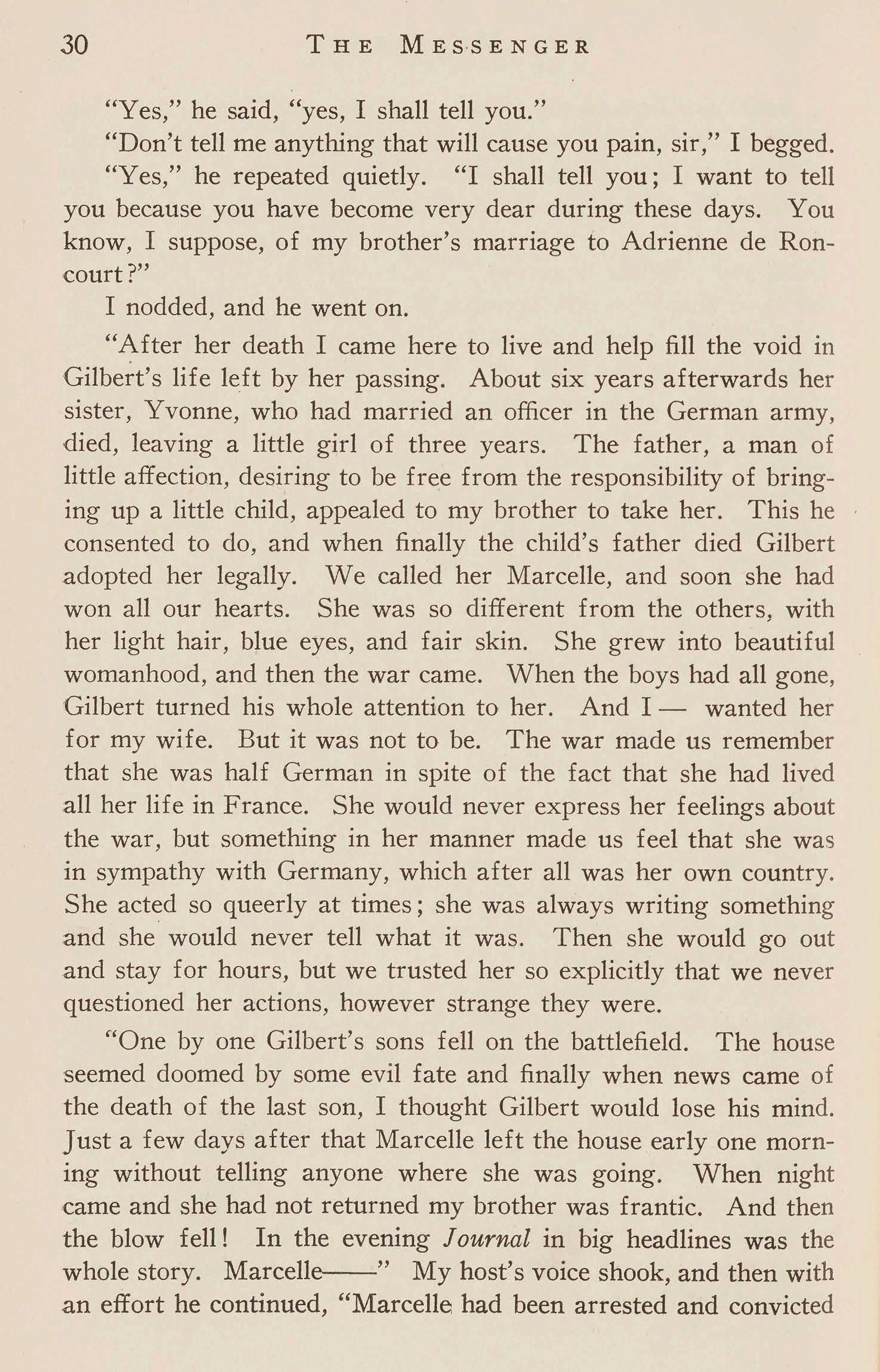 "So sad he was ," continued Julie , "so sad that he have hear d no word from his dear mother or perhaps his fiancee. Tres gentil he is , tres amiable indeed, the young lieutenant Lane. We ha v e learn to adore him here, Monsieur, and the children in the street s c annot let him rest. They run ever after him when he is in the ville. Each week when he is return to us here he say, 'Mam'selle J ulie, surely there is come a letter for me since I am away.' I hav always to say' Non, mon lieutenant, but certainly today or p erhaps tomorrow they arrive.' Then he would smile and say , ' Well, we must just be happy anyhow, c'est la guerre,' as we say, but his lips have tremble sometimes as he say it, and I am very busy at once, for I know that he would not have me see. He is so y oung, Monsieur, and one can tell that he has been much loved. He have always with him the pictures of his dear mother and his two so lovely sisters. Four months has he been from home and s till no news from them. Four months, mon capitaine, and it is much to make one sad for him. Some do not care, but he cares .so much."