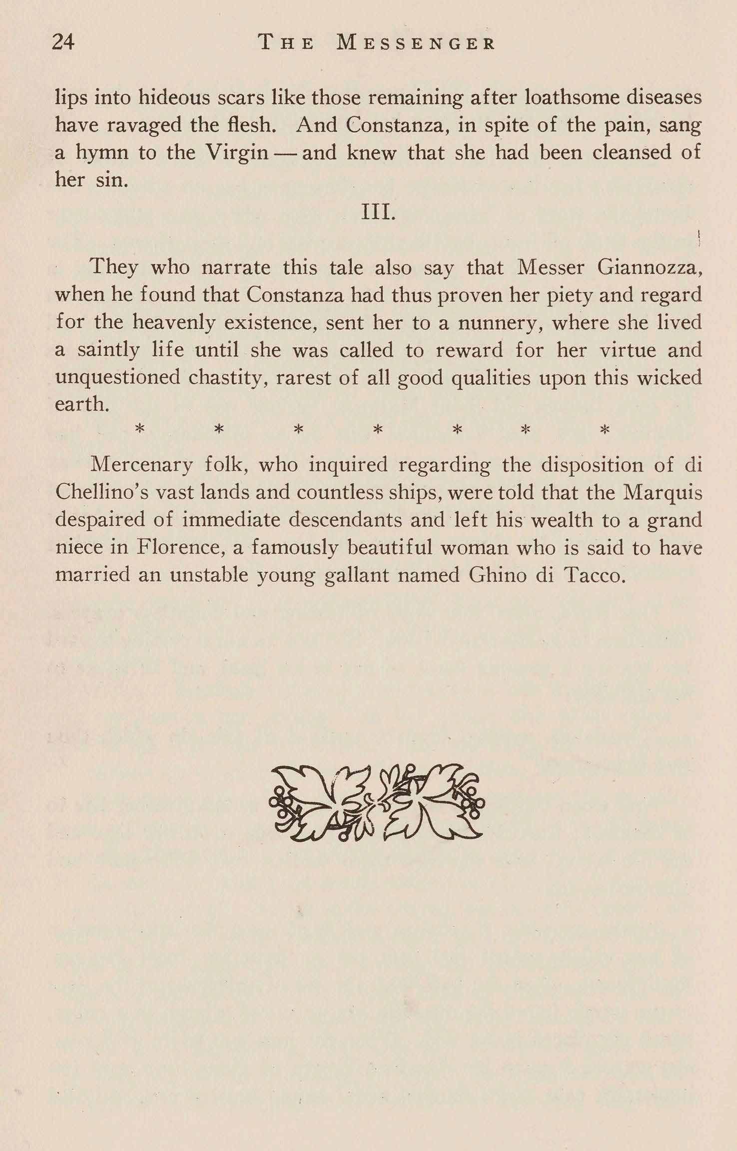Now the people of N overino further relate that, in the city of Florence, there lived a young man known as Ghino di Tacco,a youngster who respected neither the Church nor the wisdom of his elders; and who lived a life of swordplay and tavern brawling; - a roustabout, but, withal, a man of principle who never doubted that right would prevail when backed by a facile wit, a slender rapier, a firm wrist and a sure foot. In the spirit of the time, he extemporized love verses and delivered them with fatal effect upon the daughters of inn-keepers and artisans, for that he had little opportunity to converse with ladies of higher station. He heard of Constanza di Chellino, and how her father was saving her for a wealthy suitor of established family who should receive infinite wealth as a dowry. Also, he heard of the piety and profound study and the unquestioned virtue of the maiden, together with the story of her beauty-which was said to be that of autumn sunsets view from mountain heights. And Ghino was troubled : no maid of any considerable beauty should be made to spend her life in such a manner. Finally, on a wager, he determined to go to N overino and see this maiden whose reputation was that of undoubted continence and indifference to the manifold joys of this world.
