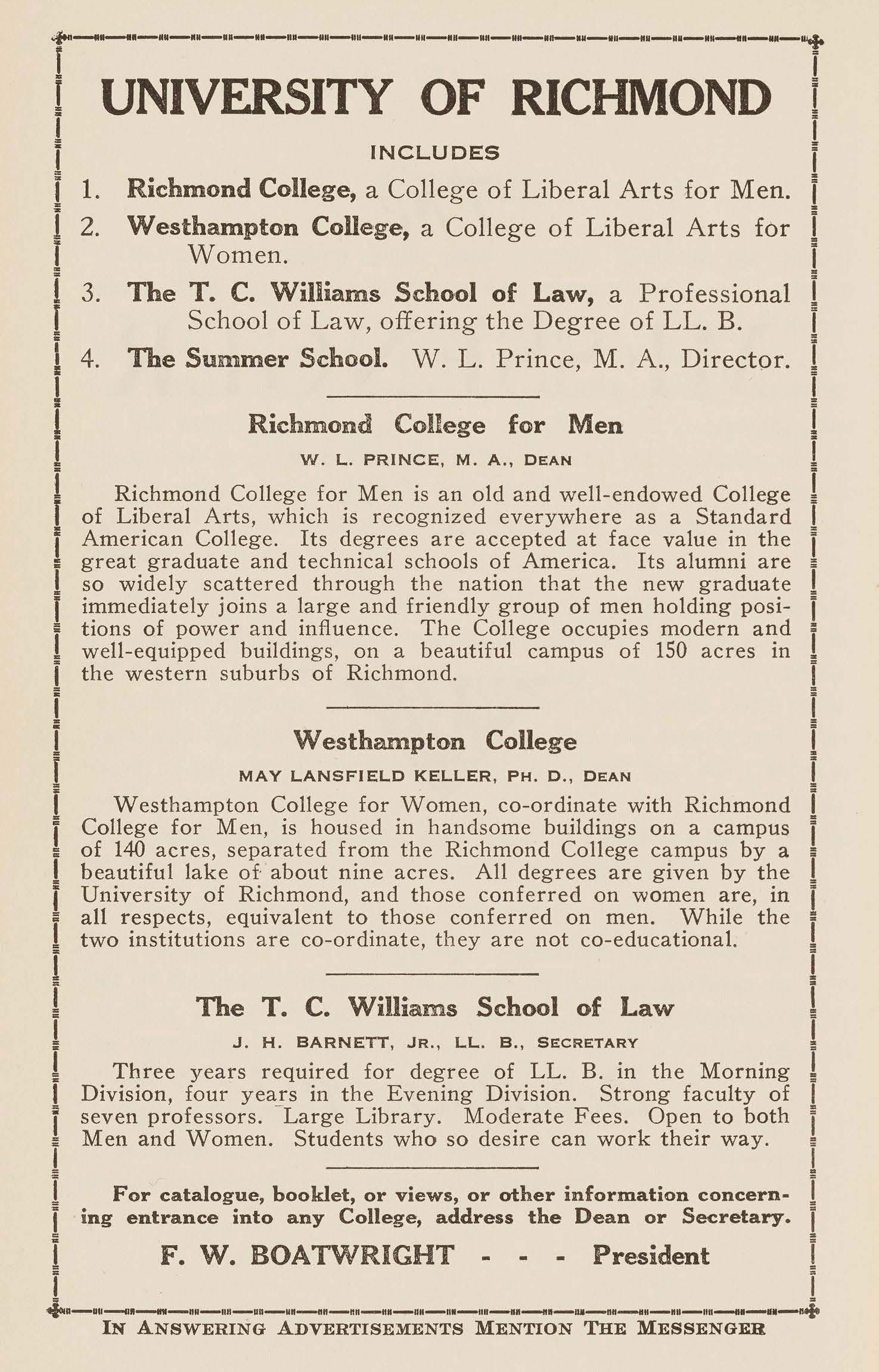Westhampton College for Women, co-ordinate with Richmond College for Men, is housed in handsome buildings on a campus of 140 acres, separated from the Richmond College campus by a beautiful lake of about nine acres. All degrees are given by the University of Richmond, and those conferred on women are, in all respects, equivalent to those conferred on men. While the two institutions are co-ordinate, they are not co-educational.