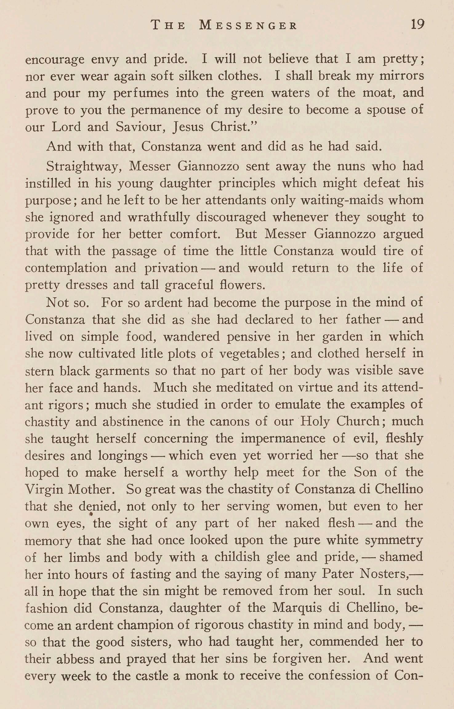 There came a time, however, when Constanza, fired by the story of the martyrs of the Church, and responding to the seclusion of her unconscious imprisonment, sought to enter holy orders , to become a nun devout and pious, - to win immortal sainthood like those women of old. And concerning this desire she spoke to Messer Giannozzo in the manner following :