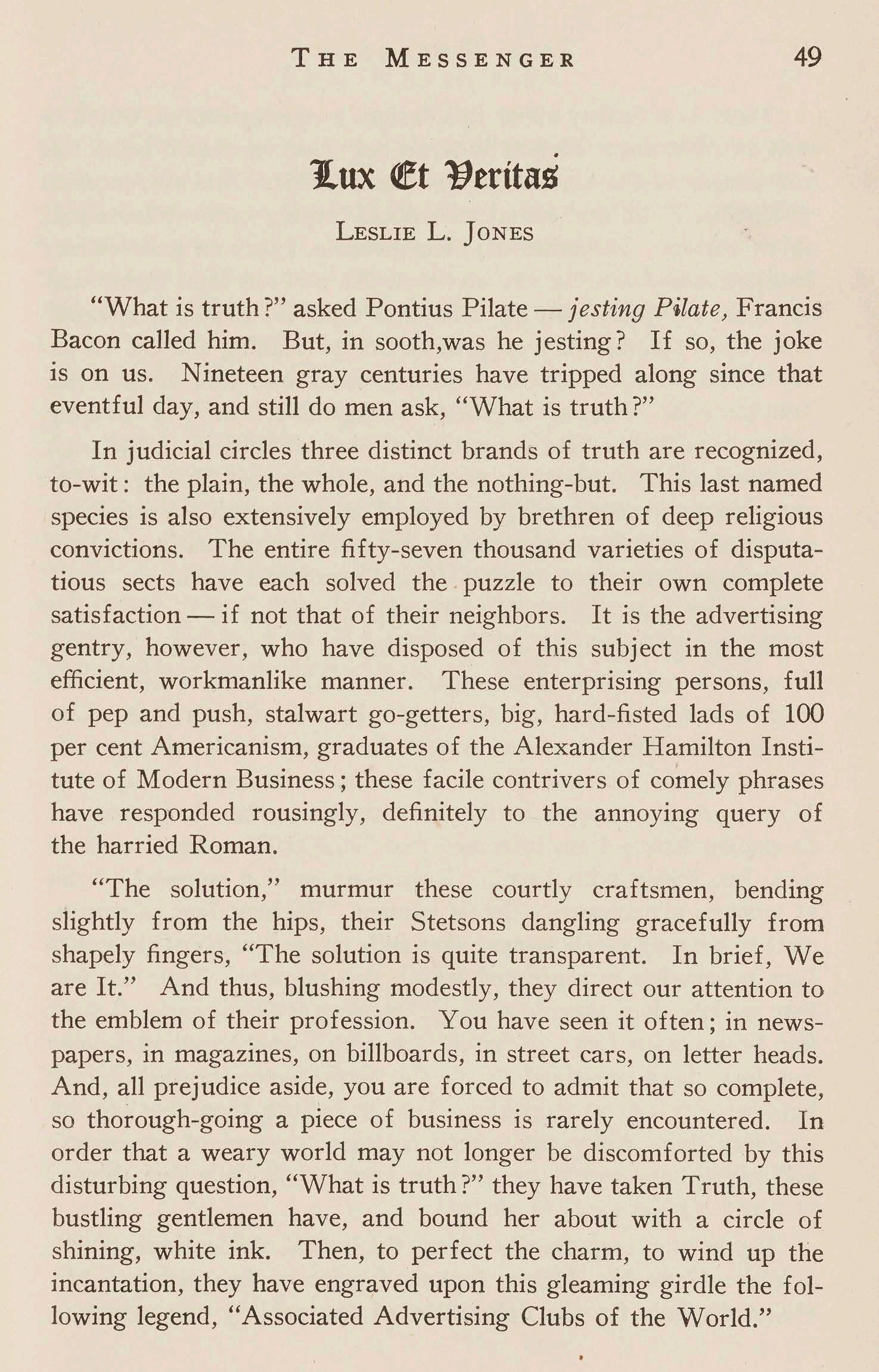 In judicial circles three distinct brands of truth are recognized, to-wit: the plain, the whole, and the nothing-but. This last named species is also extensively employed by brethren of deep religious convictions. The entire fifty-seven thousand varieties of disputatious sects have each solved the puzzle to their own complete satisfaction - if not that of their neighbors. It is the advertising gentry, however, who have disposed of this subject in the most efficient, workmanlike manner. These enterprising persons, full of pep and push, stalwart go-getters, big, hard-fisted lads of 100 per cent Americanism, graduates of the Alexander Hamilton Institute of Modern Business ; these facile contrivers of comely phrases have responded musingly, definitely to the annoying query of the harried Roman.