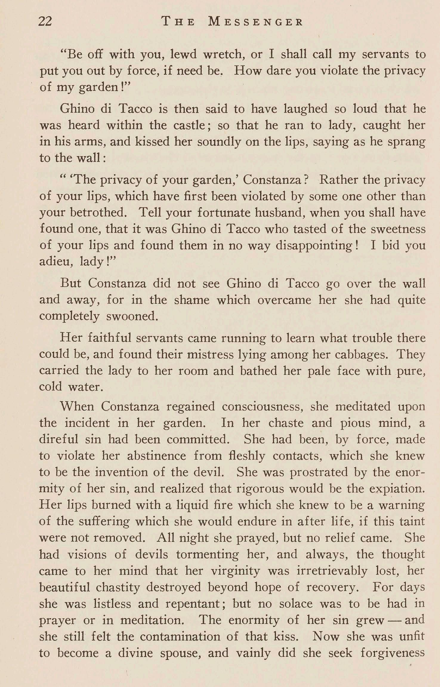 In the evening, while the lovely Constanza walked in her garden among roses and lilies and strange buds, which knew no name in the sweet Italian tongue, Sister Amalthea read from the life of St. Catherine, who , through the power of her virginity, was enabled to confound eleven learned doctors in Alexandria; and of Saint Agnes, whose chastity was so great that she sacrificed a higher position in Heaven, and refused to minister to aged, penniless men who were blind and diseased, lest her presence inspire them with thoughts of their youth and of the women they had loved and then forsaken. And Constanza , on whom the bloom of youth had descended with rare and generous good-willso that her hair fell in black clouds about her shoulders, and no rose petal could equal the softness and rosy tint of her cheeks, nor precious gems surpass the deep-lined brilliance of her eyes,Constanza, maid of seventeen summers , marveled at the virtues of the ancient saints, and asked that the good sisters tell her more concerning the way toward favor in the sight of the good Lord and the Virgin.