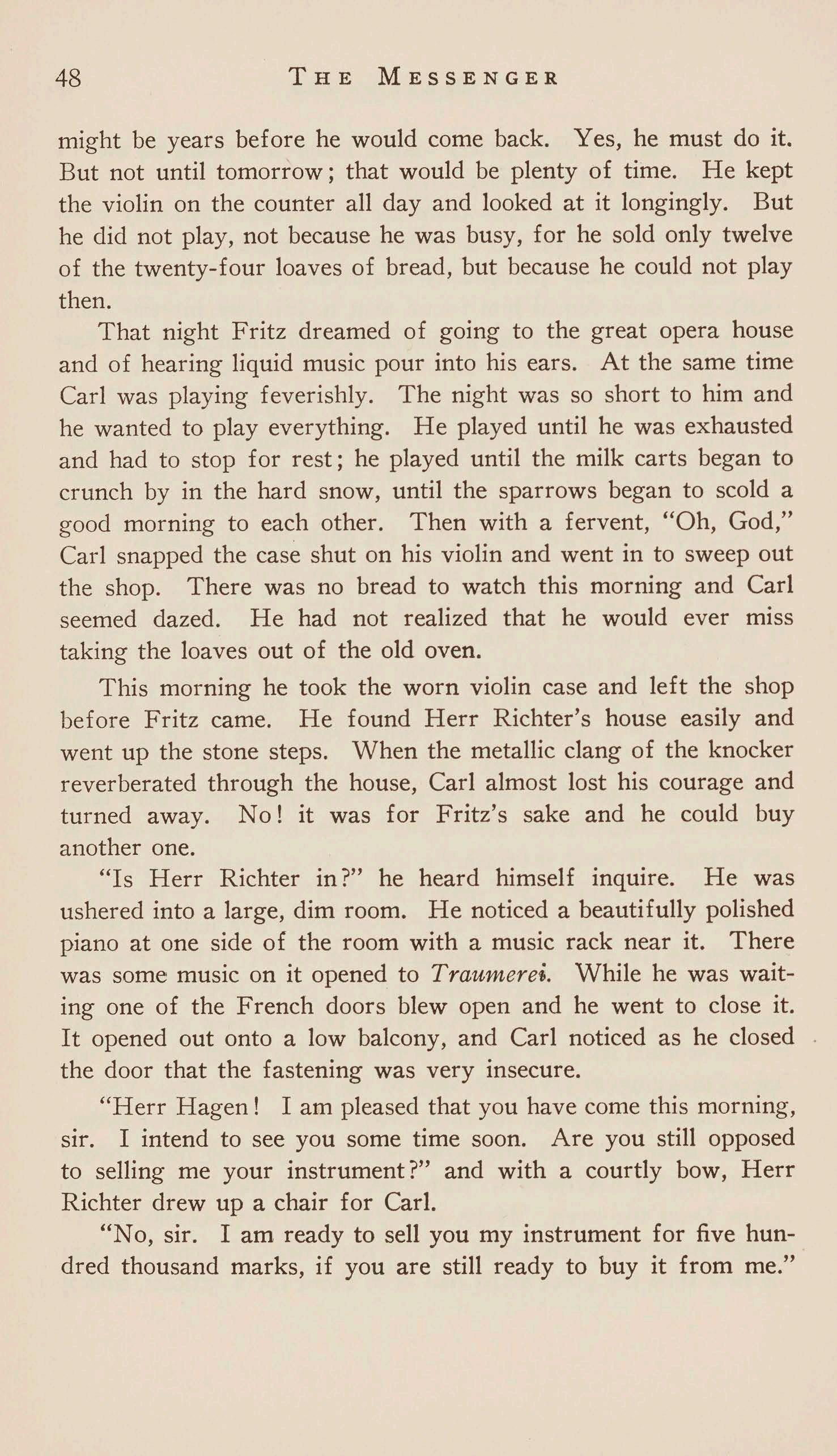 Carl could scarcely realize that he was at last offering to sell his violin. He cringed inwardly at the cold sound of his words, for it was like selling his soul. He made up his mind two years ago when Fritz had begun to show a marked interest in playing, that he would sell his violin and use the money to educate the boy. But now when the time came, it took all his strength to make the transaction. After leaving Herr Richter's house, Carl stopped by a bank and deposited his money in Fritz's name, but with himself as trustee.