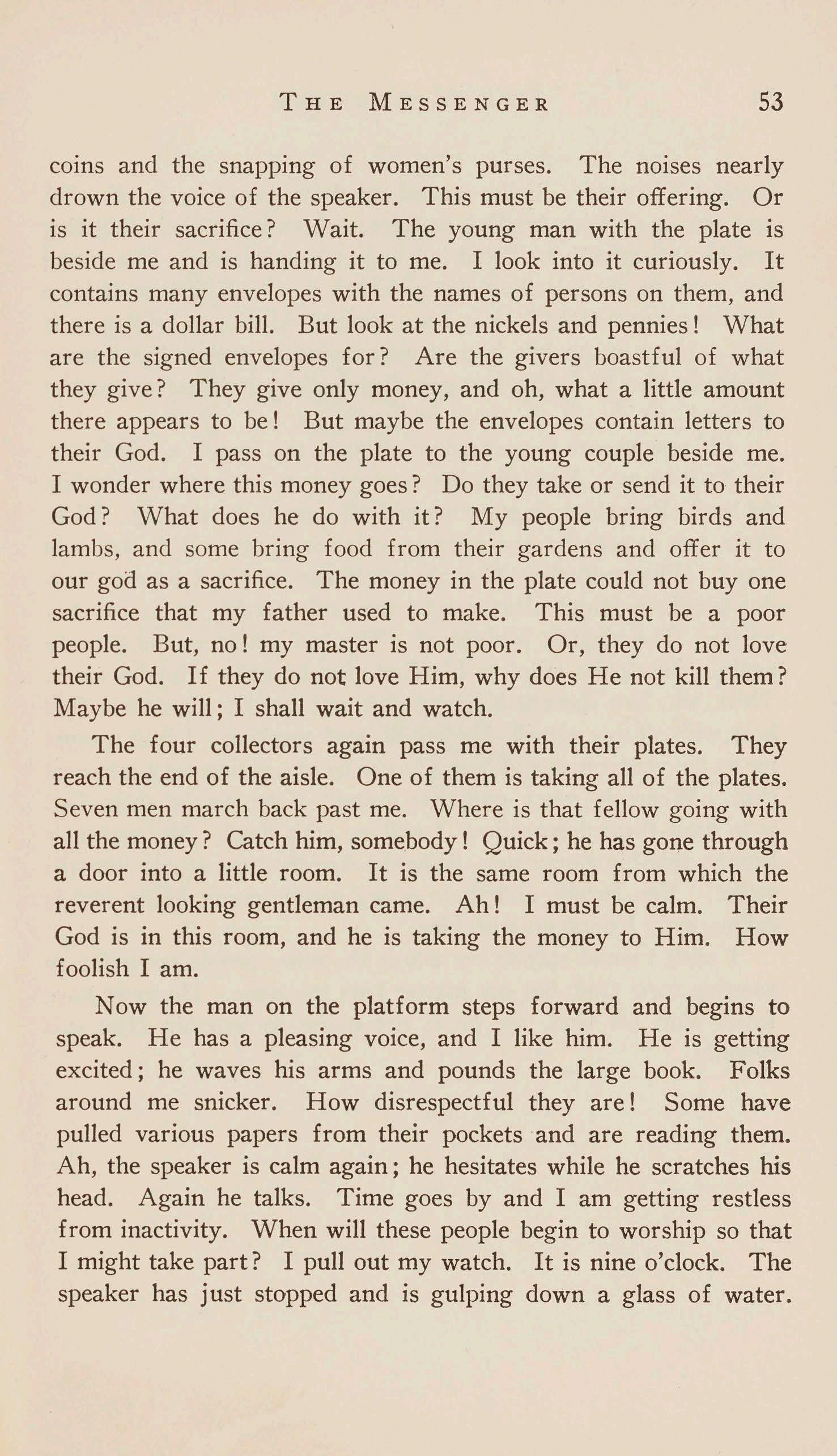 coins and the snapping of women's purses. The noises nearly drown the voice of the speaker. This must be their offering. Or is it their sacrifice? Wait. The young man with the plate is beside me and is handing it to me. I look into it curiously. It contains many envelopes with the names of persons on them, and there is a dollar bill. But look at the nickels and pennies! What are the signed envelopes for? Are the givers boastful of what they give? They give only money, and oh, what a little amount there appears to be! But maybe the envelopes contain letters to their God. I pass on the plate to the young couple beside me. I wonder where this money goes? Do they take or send it to their God? What does he do with it? My people bring birds and lambs, and some bring food from their gardens and offer it to our god as a sacrifice. The money in the plate could not buy one sacrifice that my father used to make. This must be a poor people. But, no! my master is not poor. Or, they do not love their God. If they do not love Him, why does He not kill them? Maybe he will; I shall wait and watch.