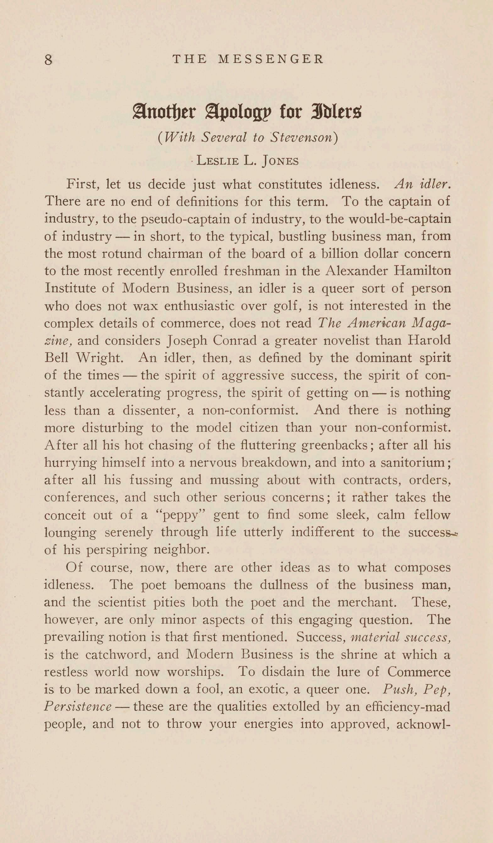 First, let us decide j u st what const itutes idleness. An idler. There are no end of definitions for t his term. To the captain of industry, to the pseudo -captain of industry, to the would-be-captain of industry - in short, to the typical, bustling business man, from the most rotund chairman of the board of a billion dollar concern to the most recently enrolled freshman in the Alexander Hamilton Instit u te of Modern Business, an idler is a queer sort of person who does not wax enthusiastic over golf, is not interested in the complex details of commerce, does not read The American Magazine, and considers Joseph Conrad a greater novelist than Harold Bell Wright. An idler, then, as defined by the dominant spirit of the times - the spirit of aggressive success, the spirit of constantly accelerating progress, the spirit of getting on - is nothing less than a dissenter, a non-conformist. And there is nothing more disturbing to the model citizen than your non-conformist. After all his hot chasing of the fluttering greenbacks; after all his hurrying himself into a nervous breakdown, and into a sanitorium; after all his fus sing and mussing about with contracts, orders, conferences, and such other serious concerns; it rather takes the conceit out of a "peppy" gent to find some sleek, calm fellow lounging serenely through life utterly indifferent to the success-,. of his perspiring neighbor.