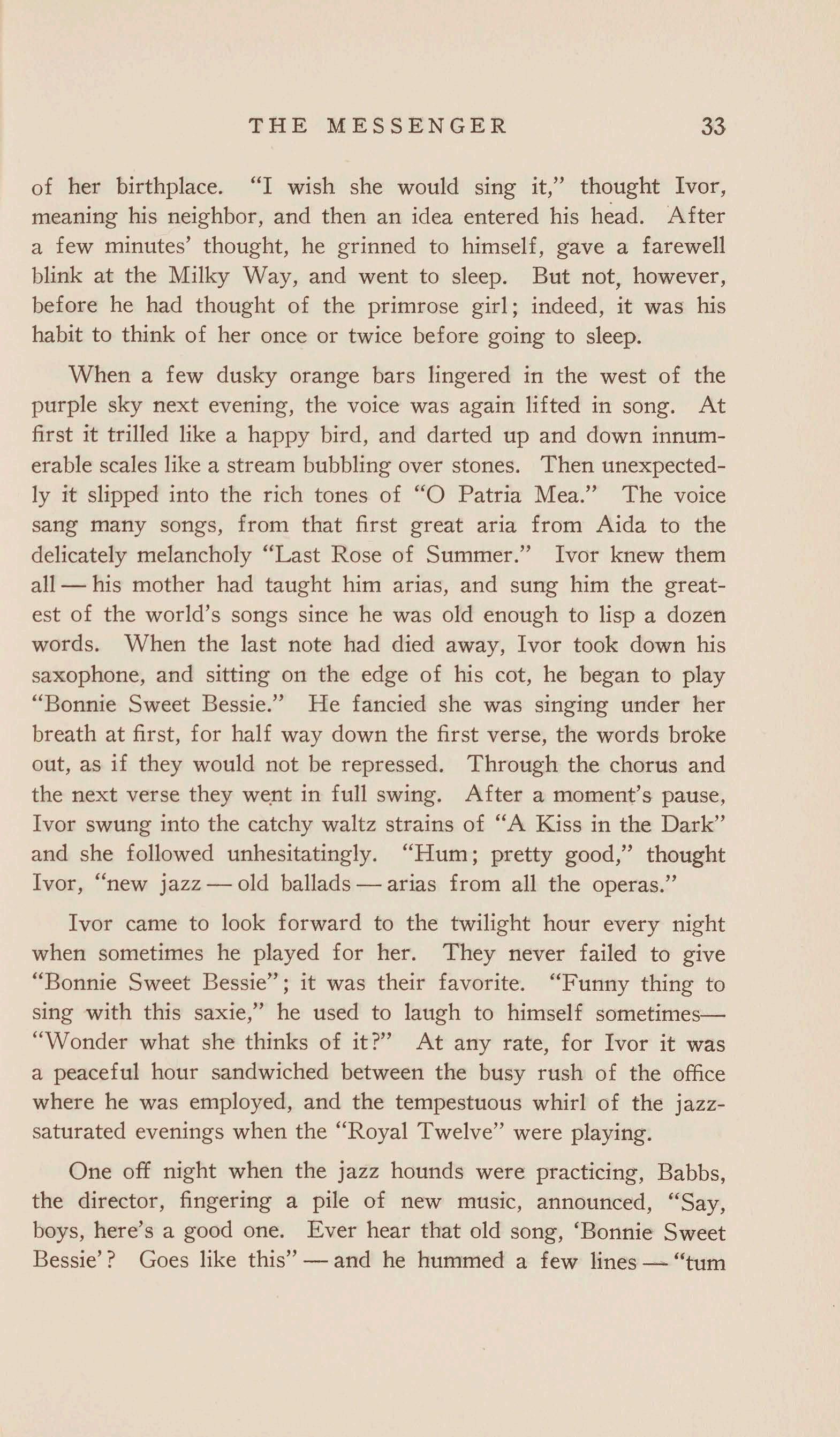 Ivor came to look forward to the twilight hour every night when sometimes he played for her. They never failed to give "Bonnie Sweet Bessie"; it was their favorite "Funny thing to sing with this saxie," he used to laugh to himself sometimes"Wonder what she thinks of it?" At any rate, for Ivor it was a peaceful hour sandwiched between the busy rush of the office where he was employed, and the tempestuous whirl of the jazzsaturated evenings when the "Royal Twelve" were playing.