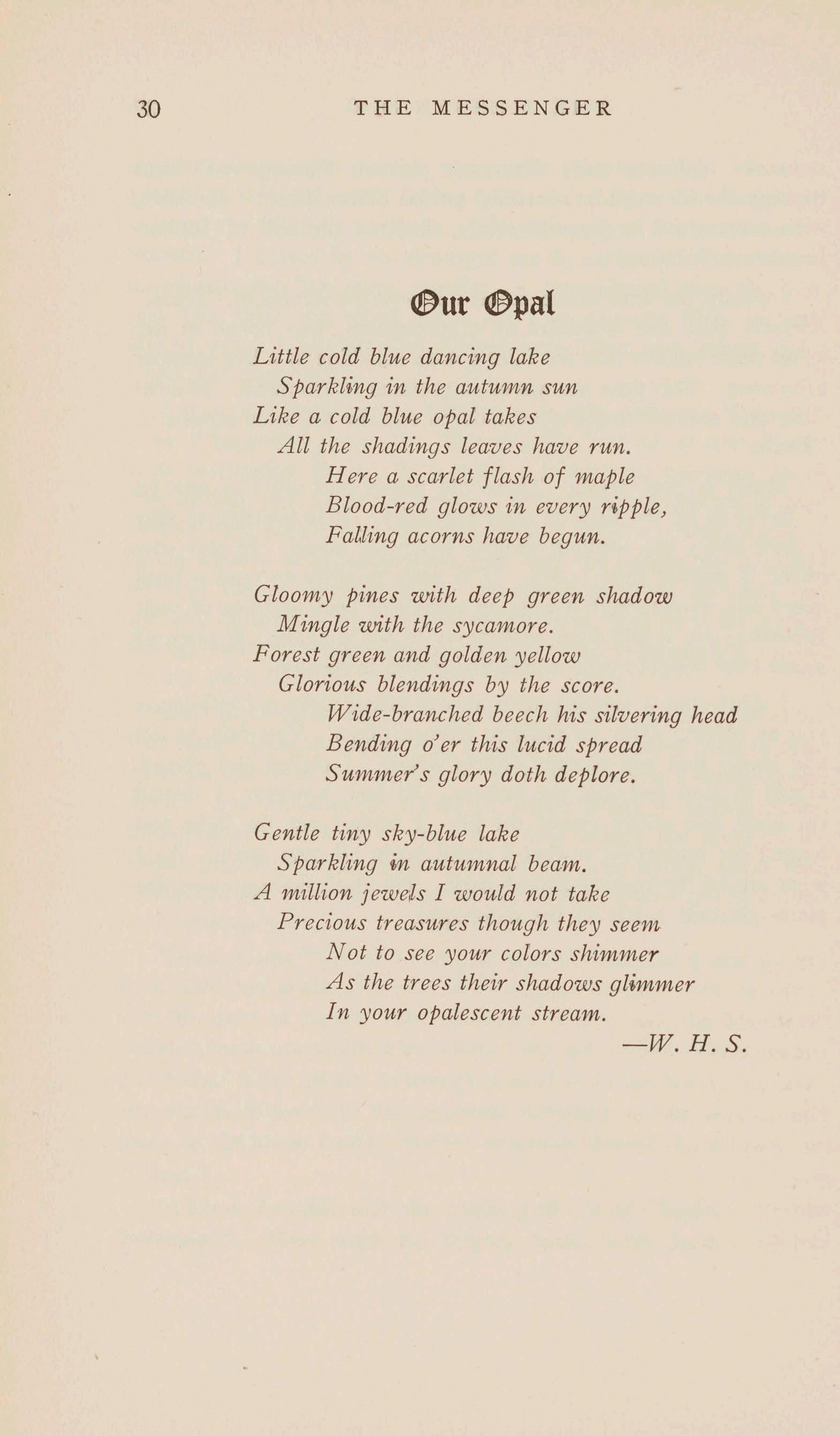 Like a cold blue opal takes All the shadings leaves have run. Here a scarlet flash of maple Blood-red glows in every ripple, Falling acorns have begun.