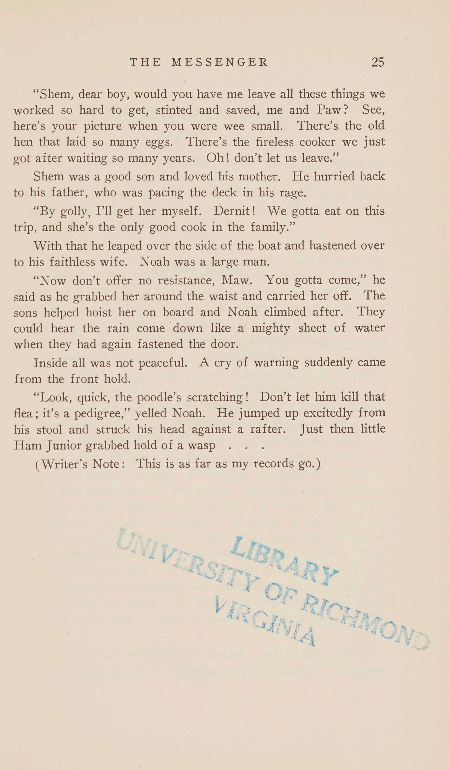 "Now don't offer no resistance, Maw. You gotta come," he said as he grabbed her around the waist and carried her off. The sons helped hoist her on board and Noah climbed after. They could hear the rain come ·down like a mighty sheet of water when they had again fastened the door.