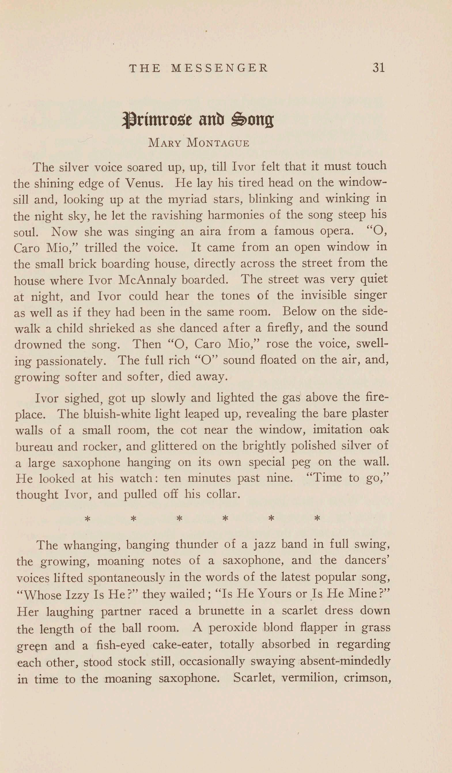 The following Saturday morning was brightly beautiful. Ivor sang blithely to himself as he dressed -funny how "Bonnie Sweet Bessie" rose to his lips. Ivor was always happy on Saturdays, for one thing, ( or maybe everything) the primrose girl would be at the dance. At eight-thirty Ivor was running down the steps and out the front door, giving it a vigorous slam that resounded loudly. He looked at the second-story window of the house across the street, in the hope, almost vain he knew, that it might see the owner of the silver voice. Just at that moment, a white arm pushed open the blinds and tossed outsomething yellow which fluttered to the pavement. Ivor cross the street eagerly and picked it up. It was a primrose.