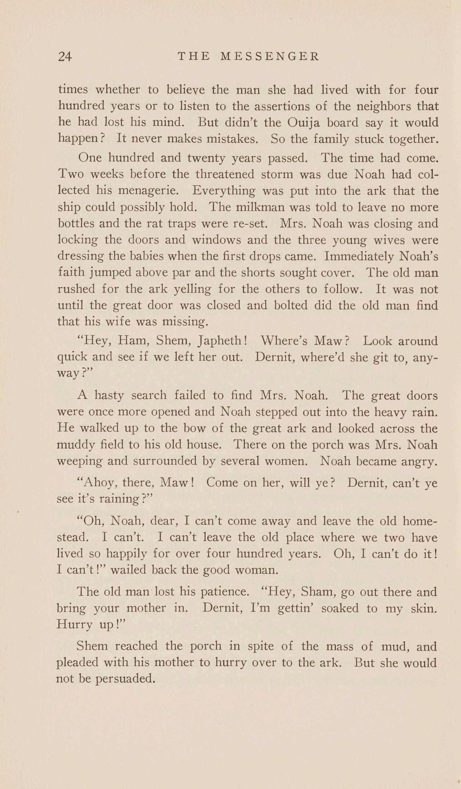 A hasty search failed to find Mrs. Noah. The great doors were once more opened and Noah stepped out into the heavy rain. He walked up to the bow of the great ark and looked across the muddy field to his old house. There on the porch was Mrs. Noah weeping and surrounded by several women. Noah became angry.