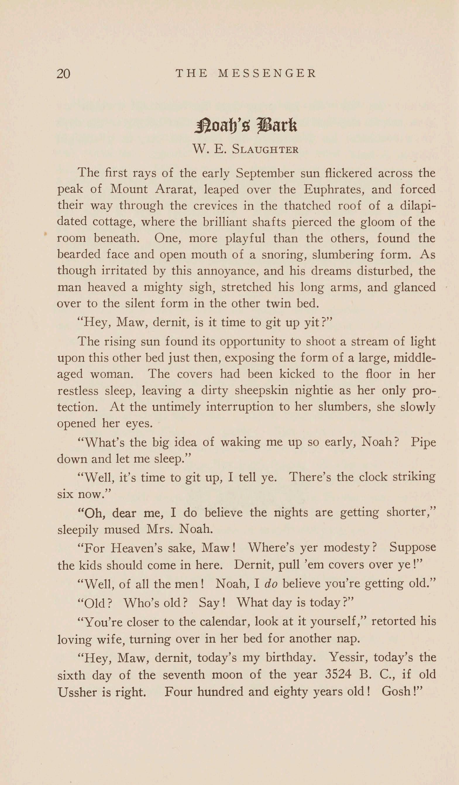 One hundred and twenty years passed. The time had come. Two weeks before the threatened storm was due Noah had collected his menagerie. Everything was put into the ark that the ship could possibly hold. The milkman was told to leave no more bottles and the rat traps were re-set. Mrs. Noah was closing and locking the doors and windows and the three young wives were dressing the babies when the first drops came. Immediately Noah's faith jumped above par and the shorts sought cover. The old man rushed for the ark yelling for the others to follow. It was not until the great door was closed and bolted did the old man find that his wife was mis sing.