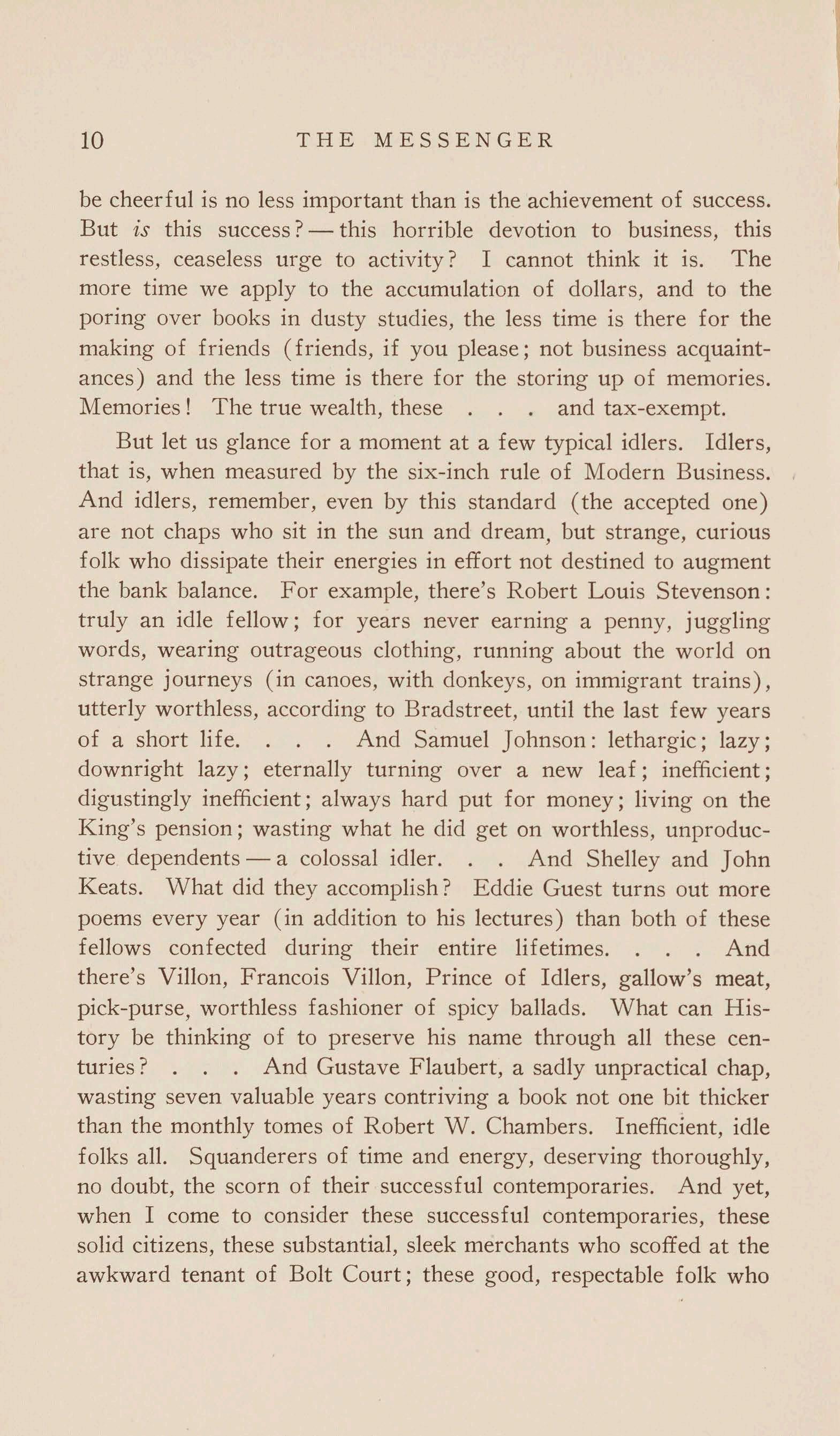 But let us glance for a moment at a few typical idlers. Idlers, that is, when measured by the six-inch rule of Modern Business. And idlers, remember, even by this standard ( the accepted one) are not chaps who sit in the sun and dream, but strange, curious folk who dissipate their energies in effort not destined to augment the bank balance. For example, there's Robert Louis Stevenson: truly an idle fellow; for years never earning a penny, juggling words, wearing outrageous clothing, running about the world on strange journeys (in canoes, with donkeys, on immigrant trains), utterly worthless, according to Bradstreet, until the last few years of a short life. And Samuel Johnson: lethargic; lazy; downright lazy; eternally turning over a new leaf; inefficient; digustingly inefficient; always hard put for money; living on the King's pension; wasting what he did get on worthless, unproductive dependents -a colossal idler. And Shelley and John Keats. What did they accomplish? Eddie Guest turns out more poems every year ( in addition to his lectures) than both of these fellows confected during their entire lifetimes. And there's Villon, Francois Villon, Prince of Idlers, gallow's meat, pick-purse, worthless fashioner of spicy ballads. What can History be thinking of to preserve his name through all these centuries? And Gustave Flaubert, a sadly unpractical chap, wasting seven valuable years contriving a book not one bit thicker than the monthly tomes of Robert W. Chambers. Inefficient, idle folks all. Squanderers of time and energy, deserving thoroughly, no doubt, the scorn of their successful contemporaries. And yet, when I come to consider these successful contemporaries, these solid citizens, these substantial, sleek merchants who scoffed at the awkward tenant of Bolt Court; these good, respectable folk who