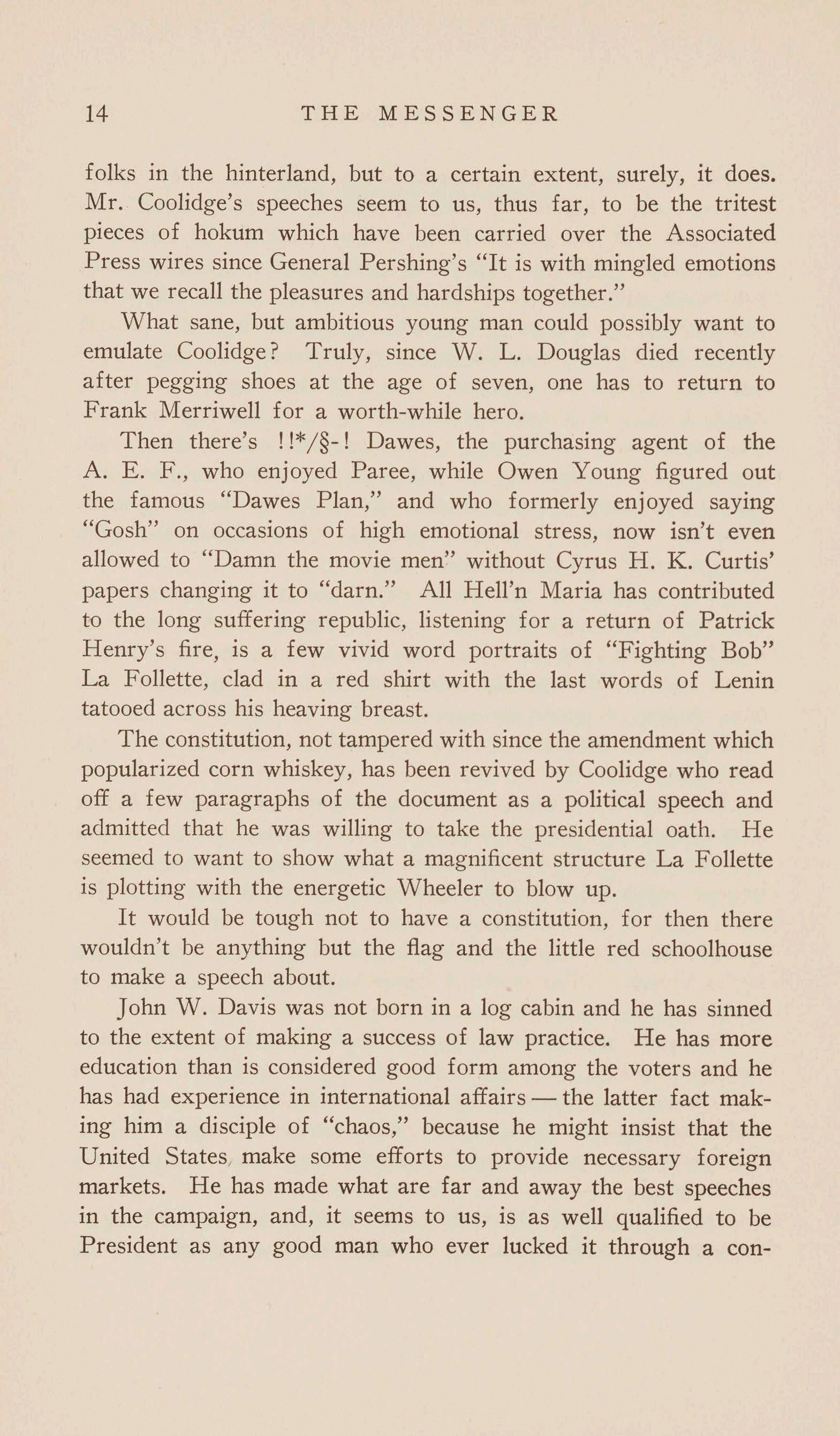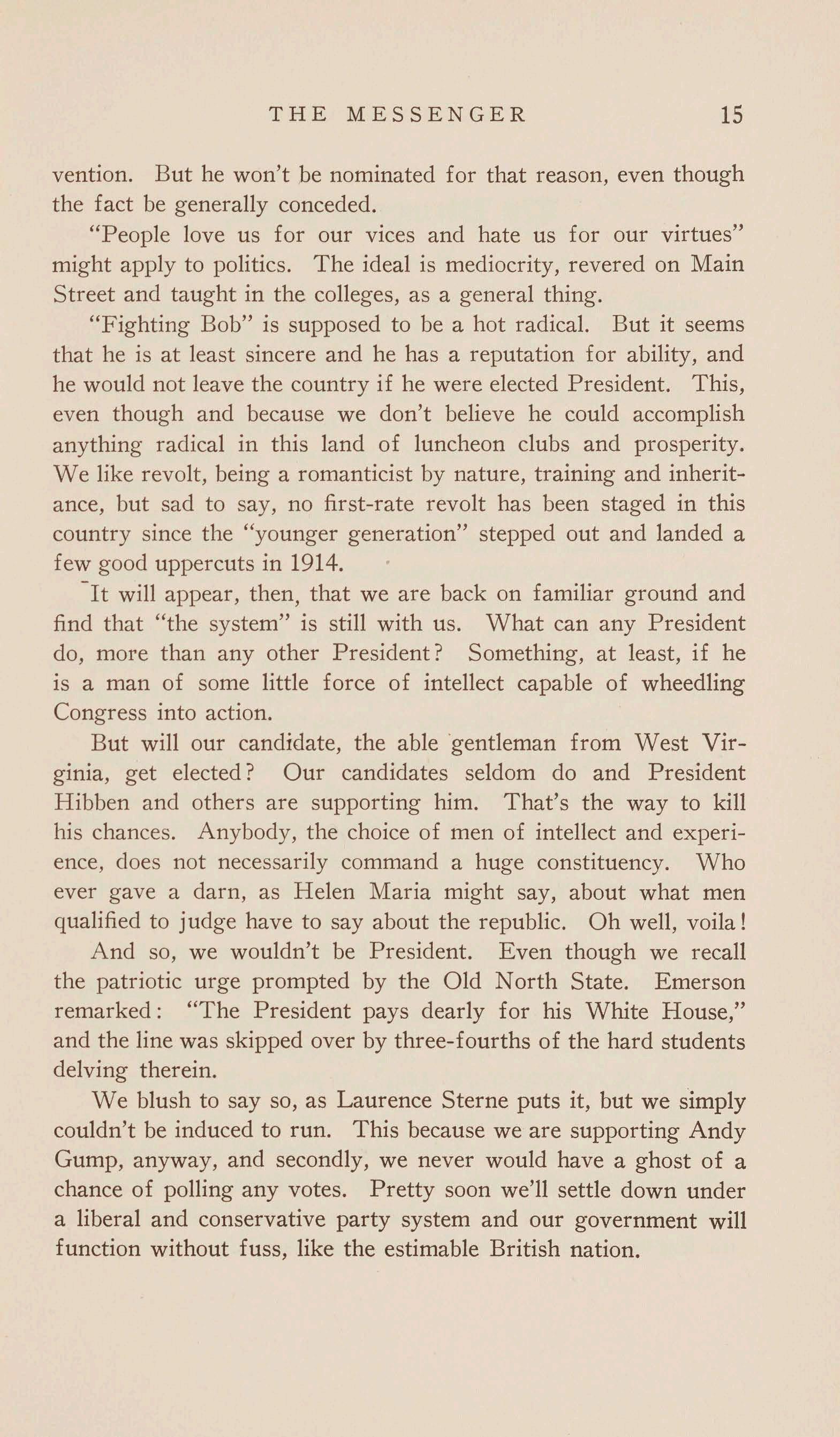 "Fighting Bob" is supposed to be a hot radical. But it seems that he is at least sincere and he has a reputation for ability, and he would not leave the country if he were elected President. This, even though and because we don't believe he could accomplish anything radical in this land of luncheon clubs and prosperity. We like revolt, being a romanticist by nature, training and inheritance, but sad to say, no first-rate revolt has been staged in this country since the "younger generation" stepped out and landed a few good uppercuts in 1914.