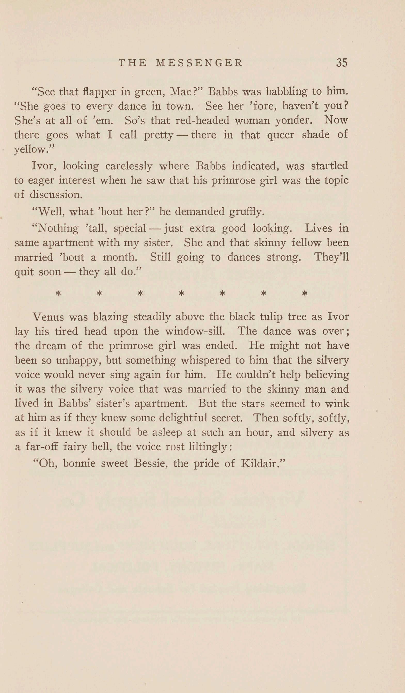 Venus was blazing steadily above the black tulip tree as Ivor lay his tired head upon the window-sill. The dance was over; the dream of the primrose girl was ended. He might not have been so unhappy, but something whispered to him that the silvery voice would never sing again for him. He couldn't help believing it was the silvery voice that was married to the skinny man and lived in Babbs' sister's apartment. But the stars seemed to wink at him as if they knew some delightful secret. Then softly, softly, as if it knew it should be asleep at such an hour, and silvery as a far-off fairy bell, the voice rost liltingly :