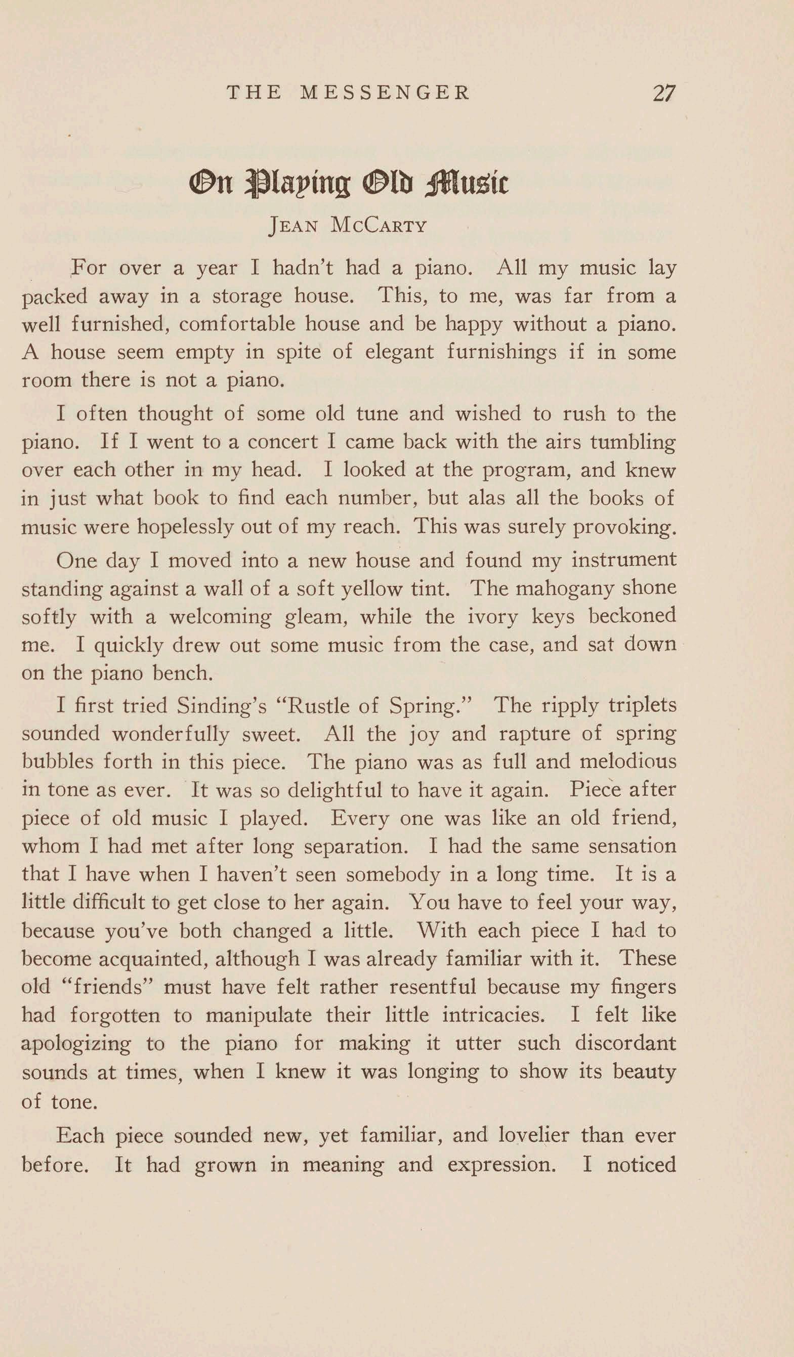 I first tried Sinding's "Rustle of Spring." The ripply triplets sounded wonderfully sweet. All the joy and rapture of spring bubbles forth in this piece. The piano was as full and melodious in tone as ever . It was so delightful to have it again. Piece after piece of old music I played. Every one was like an old friend, whom I had met after long separation. I had the same sensation that I have when I haven't seen somebody in a long time. It is a little difficult to get close to her again. You have to feel your way, because you've both changed a little. With each piece I had to become acquainted, although I was already familiar with it. These old "friends" must have felt rather resentful because my fingers had forgotten to manipulate their little intricacies. I felt like apologizing to the piano for making it utter such discordant sounds at times, when I knew it was longing to show its beauty of tone.