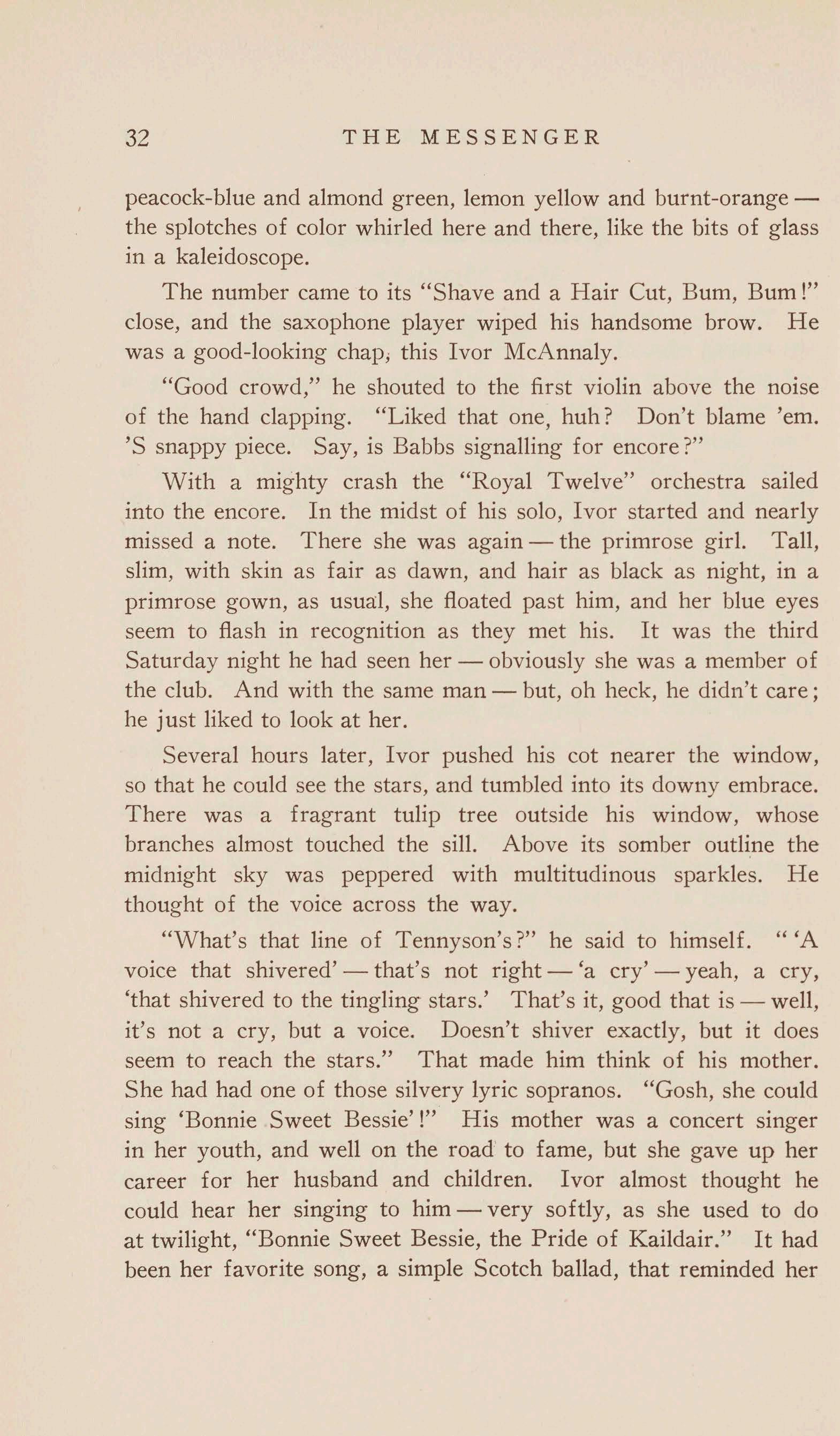 "What's that line of Tennyson's?" he said to himself. " 'A voice that shivered' - that's not right-'a cry' - yeah, a cry, 'that shivered to the tingling stars.' That's it, good that is - well, it's not a cry, but a voice Doesn't shiver exactly, but it does seem to reach the stars." That made him think of his mother. She had had one of those silvery lyric sopranos. "Gosh, she could sing 'Bonnie Sweet Bessie' !" His mother was a concert singer in her youth, and well on the road to fame, but she gave up her career for her husband and children. Ivor almost thought he could hear her singing to him -very softly, as she used to do at twilight, "Bonnie Sweet Bessie, the Pride of Kaildair." It had been her favorite song, a simple Scotch ballad, that reminded her