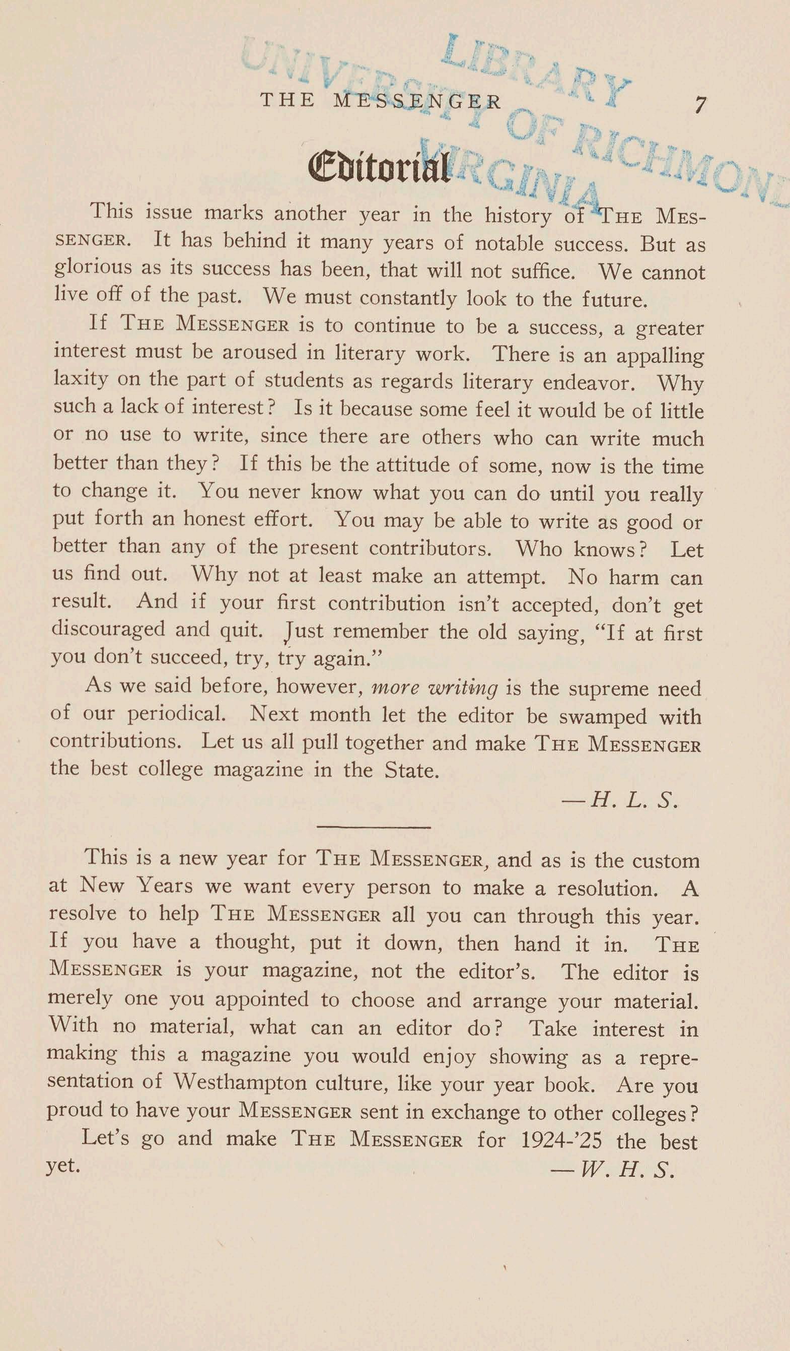 This is a new year for THE MESSENGER,and as is the custom at New Years we want every person to make a resolution. A resolve to help THE MESSENGERall you can through this year. If you have a thought, put it down, then hand it in. THE MESSENGERis your magazine, not the editor's. The editor is merely one you appointed to choose and arrange your material. With no material, what can an editor do? Take interest in making this a magazine you would enjoy showing as a representation of Westhampton culture, like your year book. Are you proud to have your MESSENGERsent in exchange to other colleges?