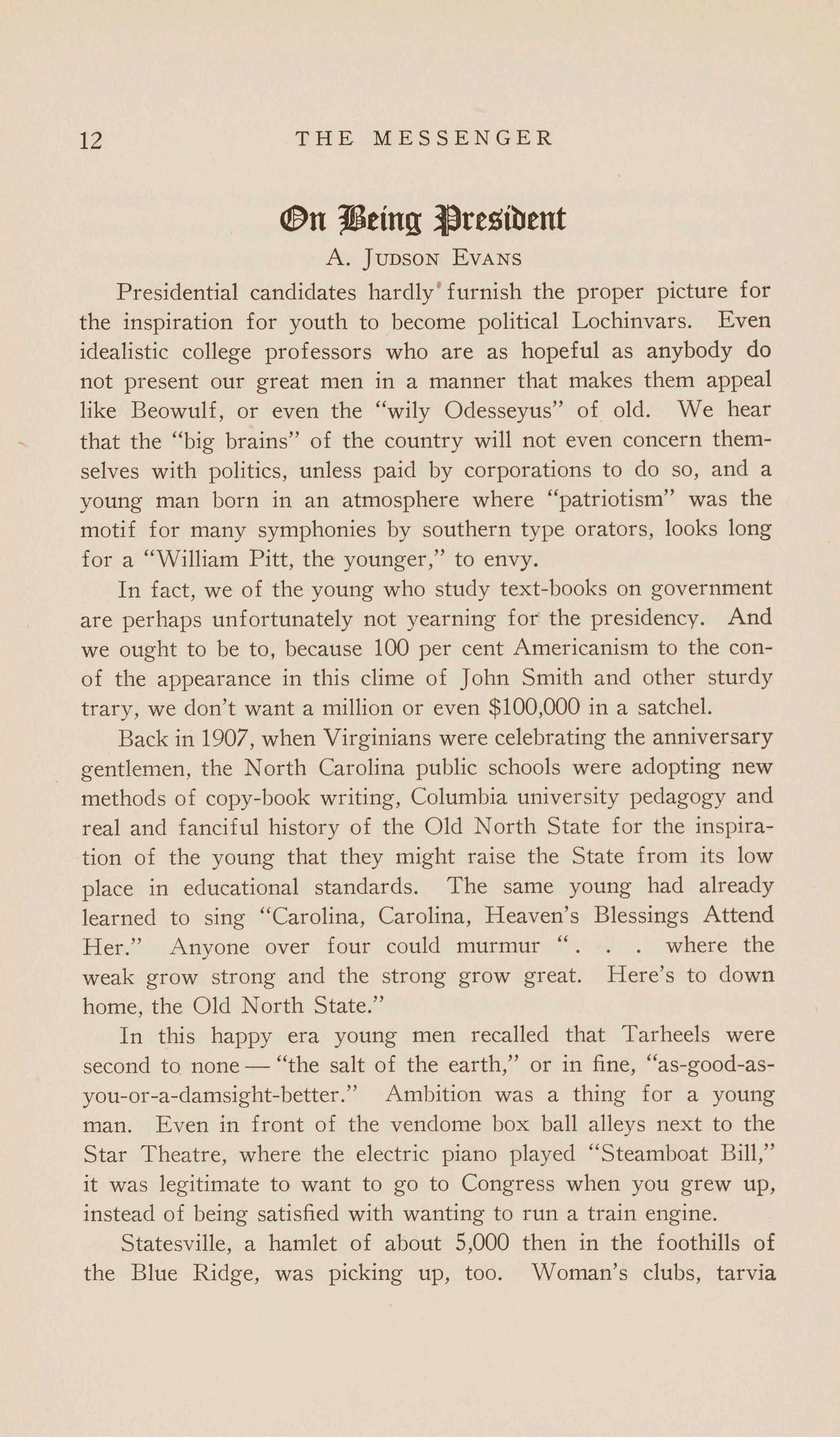 And so, we wouldn't be President. Even though we recall the patriotic urge prompted by the Old North State. Emerson remarked: "The President pays dearly for his White House," and the line was skipped over by three-fourths of the hard students delving therein.