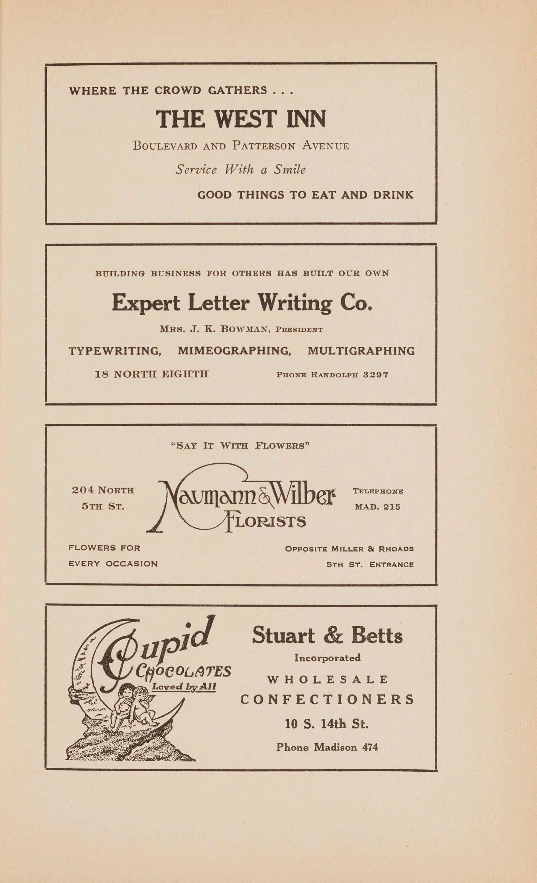 Richmond College for Men is an old and well-endowed College of Liberal Arts, which is recognized everywhere as a Standard American College. Its degrees are accepted at face value in the great graduate and technical schools of America. Its alumni are so widely scattered through the nation that the new graduate immediately joins a large and friendly group of men holding positions of power and influence. The College occupies modern and well-equipped buildings, on a beautiful campus of 150 acres in the western suburbs of Richmond.