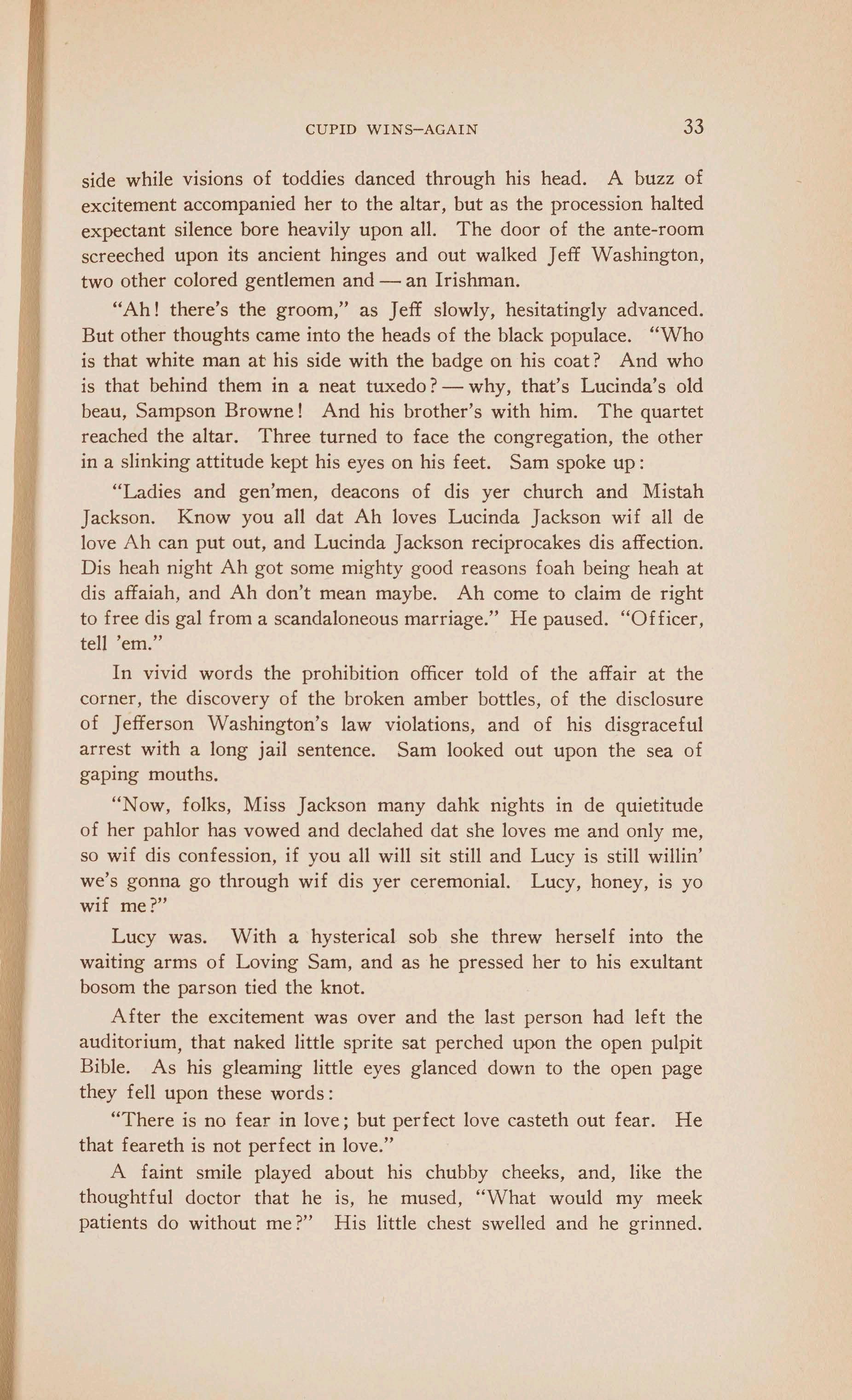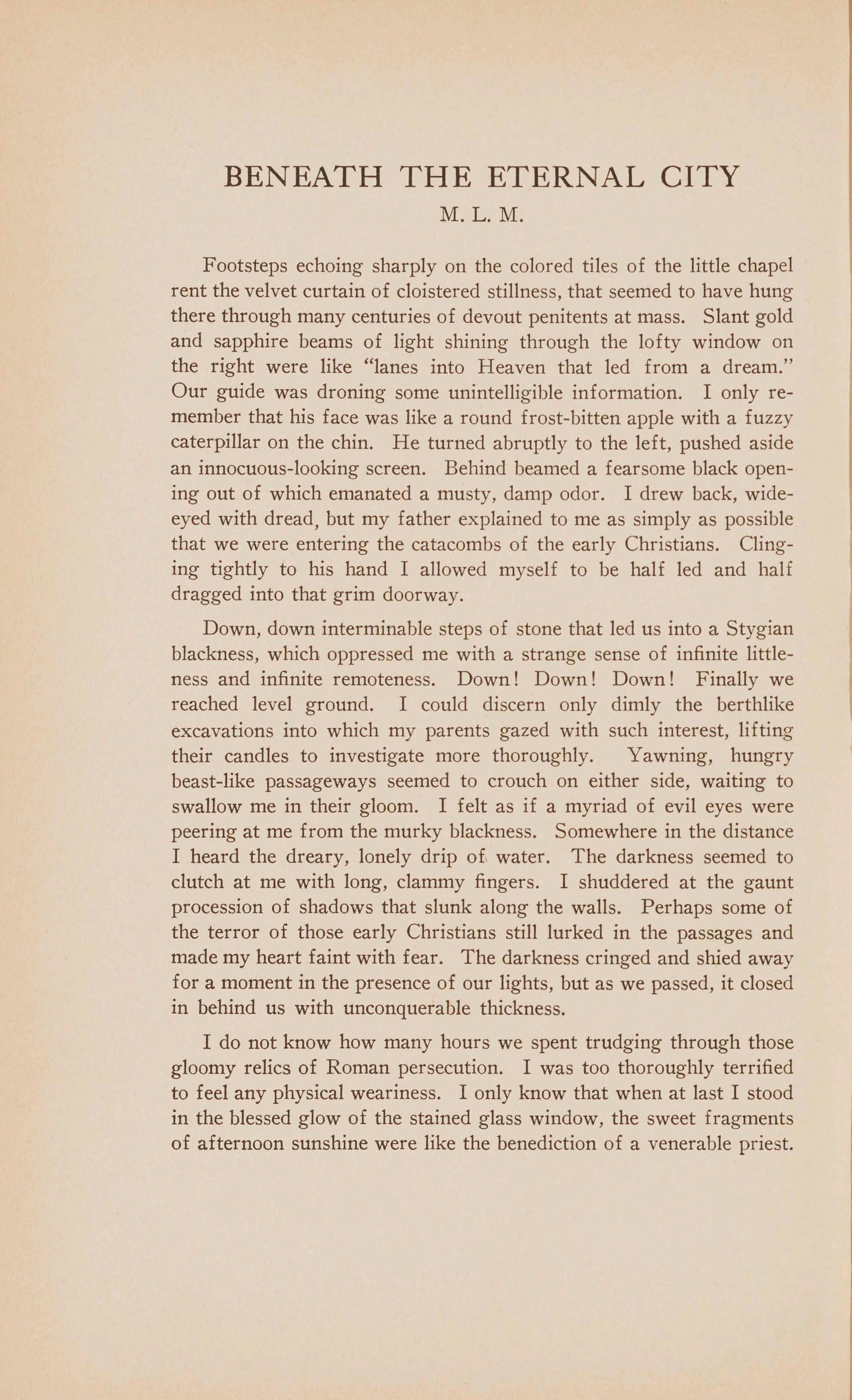 Down, down interminable steps of stone that led us into a Stygian blackness, which oppressed me with a strange sense of infinite littleness and infinite remoteness. Down ! Down! Down ! Finally we reached level ground. I could discern only dimly the berthlike excavations into which my parents gazed with such interest, lifting their candles to investigate more thoroughly. Yawning, hungry beast-like passageways seemed to crouch on either side, waiting to swallow me in their gloom. I felt as if a myriad of evil eyes were peering at me from the murky blackness. Somewhere in the distance I heard the dreary, lonely drip of water. The darkness seemed to clutch at me with long, clammy fingers. I shuddered at the gaunt procession of shadows that slunk along the walls. Perhaps some of the terror of those early Christians still lurked in the passages and made my heart faint with fear. The darkness cringed and shied away for a moment in the presence of our lights, but as we passed, it closed in behind us with unconquerable thickness.