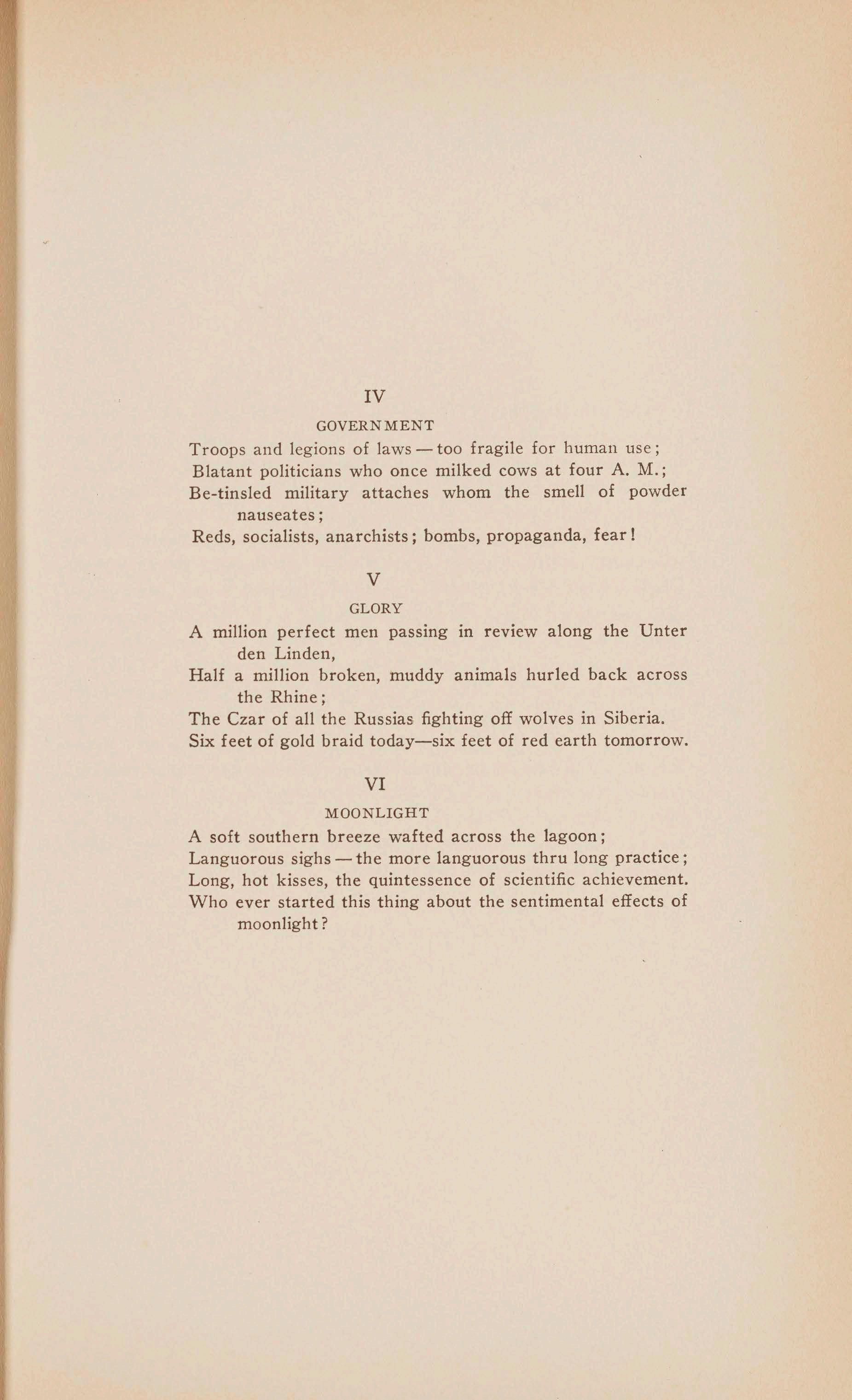 upon the shoulder of tall, young lads, and turns the turbines (in more ways than one) of long, grey ships of war. So then, I say to myself, what can be more fitting than that these bits of colored cloth should rest here in the midst of the gods they once protected that lump of coal over there, this mass of crude ore, those great slabs of polished lumber. And I begin to wonder, vaguely, if those lads who plodded through many a league of foreign mud, weary, white-lipped , with throbbing hearts-those who left their bones in some cabbage field of France, and those who brought these flags proudly back home again -I begin to wonder if they had ever thought of this whole, mad business as a struggle for dividends, a struggle for discounts, and for profits. Little thinking was done just then, and Youth is always Youth when the colors whip about the staff, and the roll of an ass's hide sets the pulse to racing. Marching men do not think. Only afterwards do the "'eroes of the nation" have leisure to reflect. And should a chap,I murmur to myself, - who once trudged heavily along beneath the folds of these banners see them now in their setting of timber, and coal, and cornfield peas, and should he smile a bit cynically at our fine phrases of '17-'18, truly I could not with justice reprove him. Have we not shoved the ideals for which he gave youth into the cellars of our minds as we have thrust his banners into the basements of our buildings?