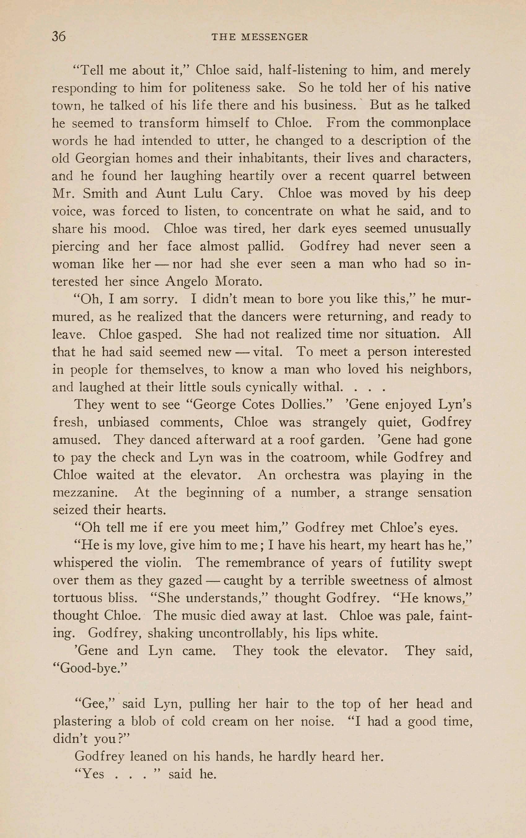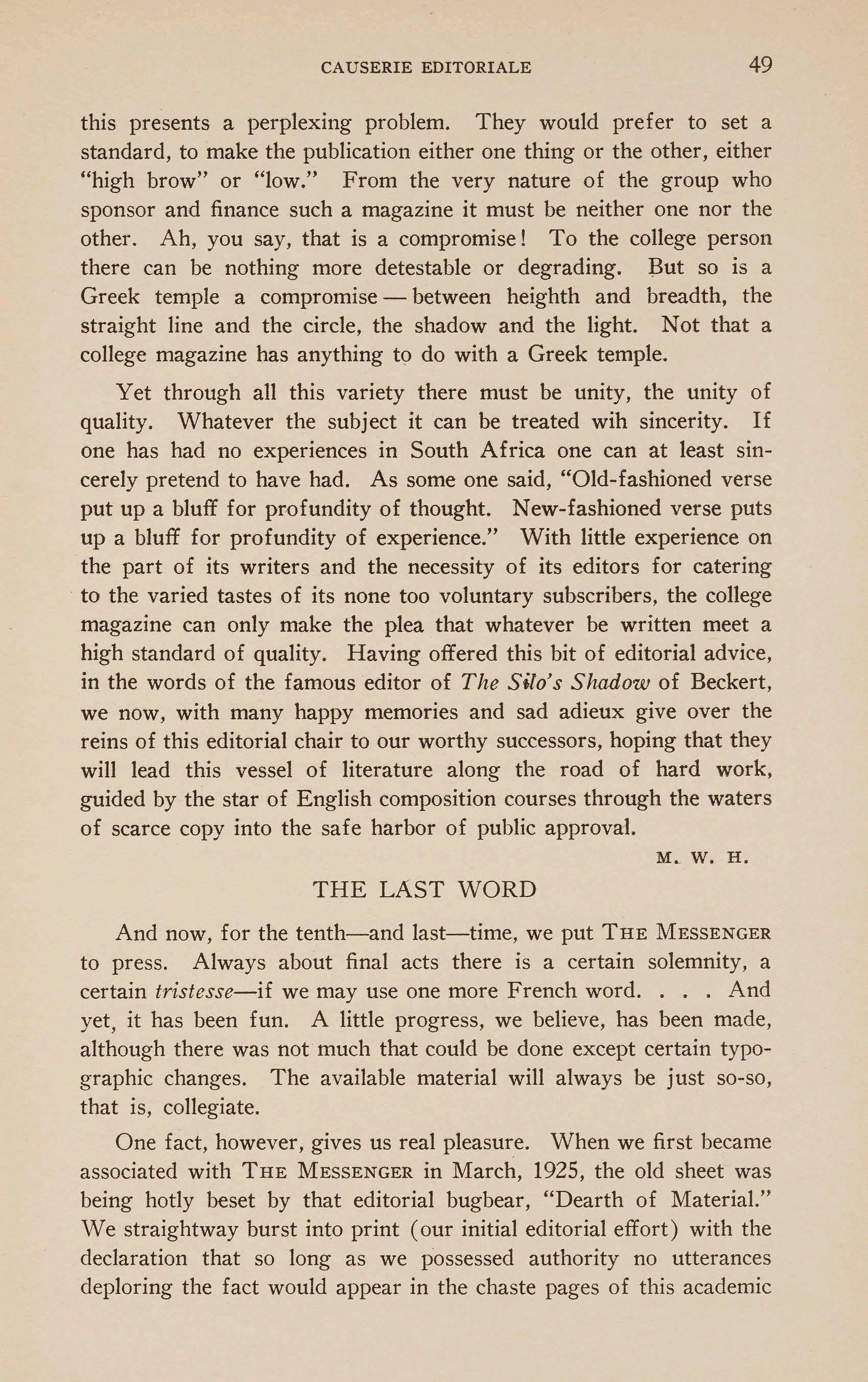 And now, for the tenth-and last-time, we put THE MESSENGER to press. Always about final acts there is a certain solemnity, a certain tristesse-if we may use one more French word. . . And yet, it has been fun. A little progress, we believe, has been made, although there was not much that could be done except certain typographic changes. The available material will always be just so-so, that is, collegiate.