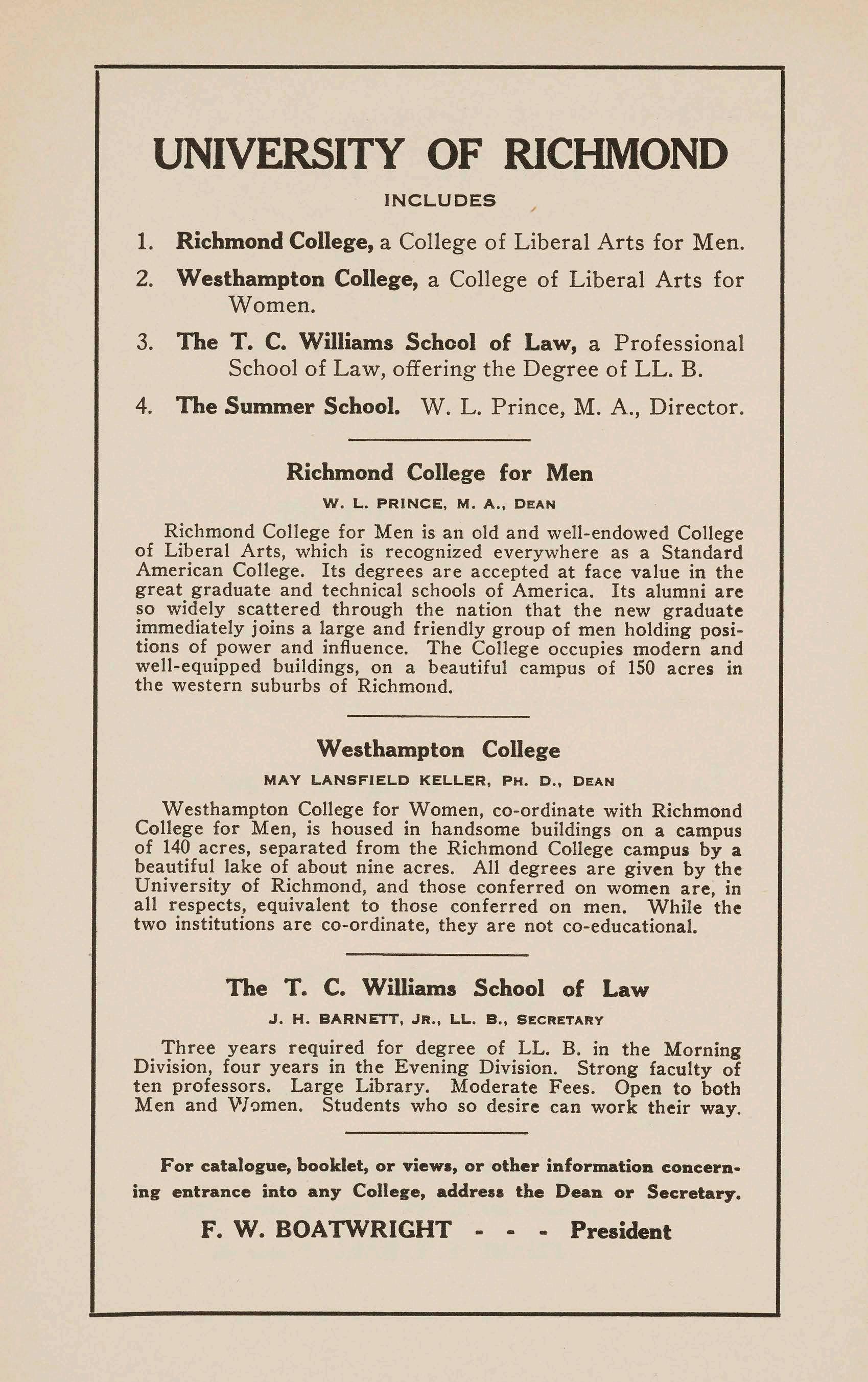 Richmond College for Men is an old and well-endowed College of Liberal Arts, which is recognized everywhere as a Standard American College. Its degrees are accepted at face value in the great graduate and technical schools of America. Its alumni arc so widely scattered through the nation that the new graduate immediately joins a large and friendly group of men holding positions of power and influence. The College occupies modern and well-equipped buildings, on a beautiful campus of 150 acres in the western suburbs of Richmond.