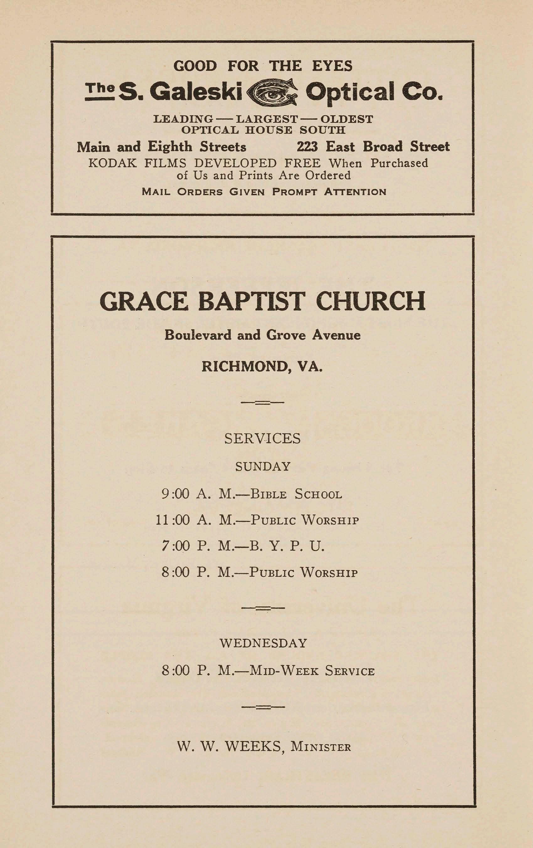 Church Services: Preaching Sundays 11 :00 A. M. and 8 :00 P. M. Prayer 1fceting Wednesday 8 :15 P. M.