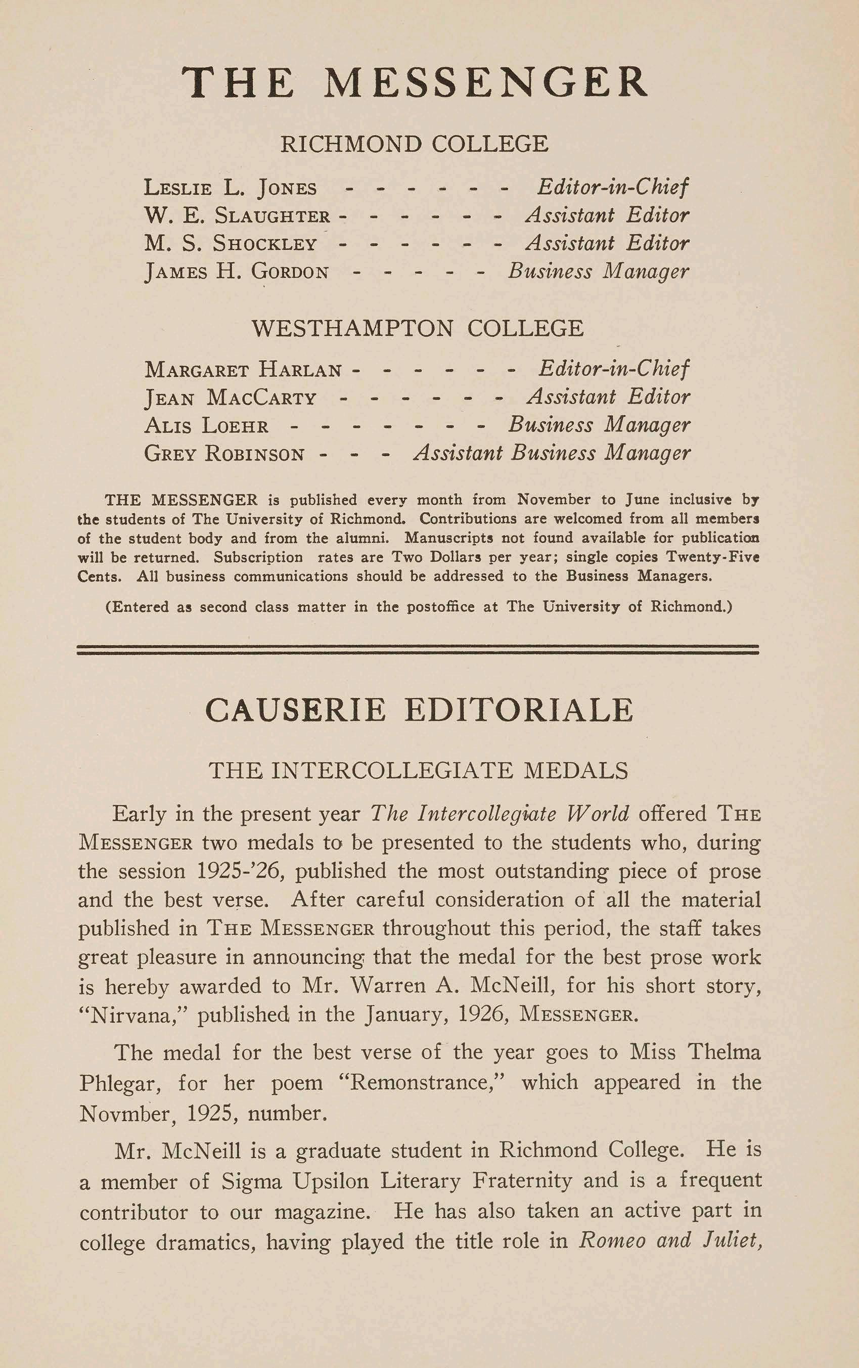 Early in the present year The Intercollegiate World offered THE MESSENGERtwo medals to be presented to the students who, during the session 1925-'26, published the most outstanding piece of prose and the best verse. After careful consideration of all the material published in THE MESSENGERthroughout this period, the staff takes great pleasure in announcing. that the medal for the best prose work is hereby awarded to Mr. Warren A. McNeill, for his short story, "Nirvana," published in the January, 1926, MESSENGER.