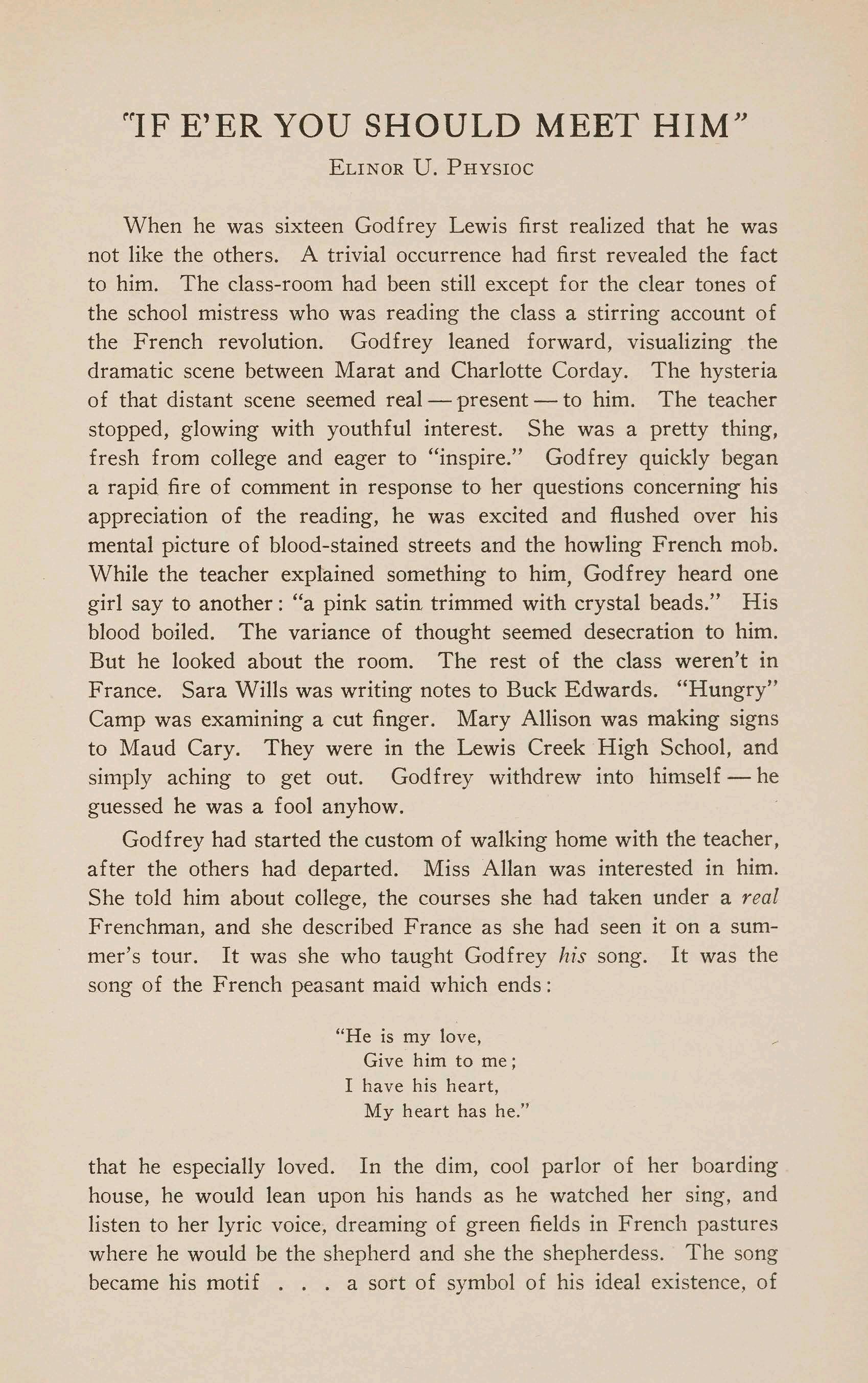 Yet through all this variety there must be unity, the unity of quality. Whatever the subject it can be treated wih sincerity. If one has had no experiences in South Africa one can at least sincerely pretend to have had. As some one said, "Old-fashioned verse put up a bluff for profundity of thought. New-fashioned verse puts up a bluff for profundity of experience." With little experience on the part of its writers and the necessity of its editors for catering to the varied tastes of its none too voluntary subscribers, the college magazine can only make the plea that whatever be written meet a high standard of quality. Having offered this bit of editorial advice, in the words of the famous editor of The Silo's Shadow of Beckert, we now, with many happy memories and sad adieux give over the reins of this editorial chair to our worthy successors, hoping that they will lead this vessel of literature along the road of hard work, guided by the star of English composition courses through the waters of scarce copy into the safe harbor of public approval.