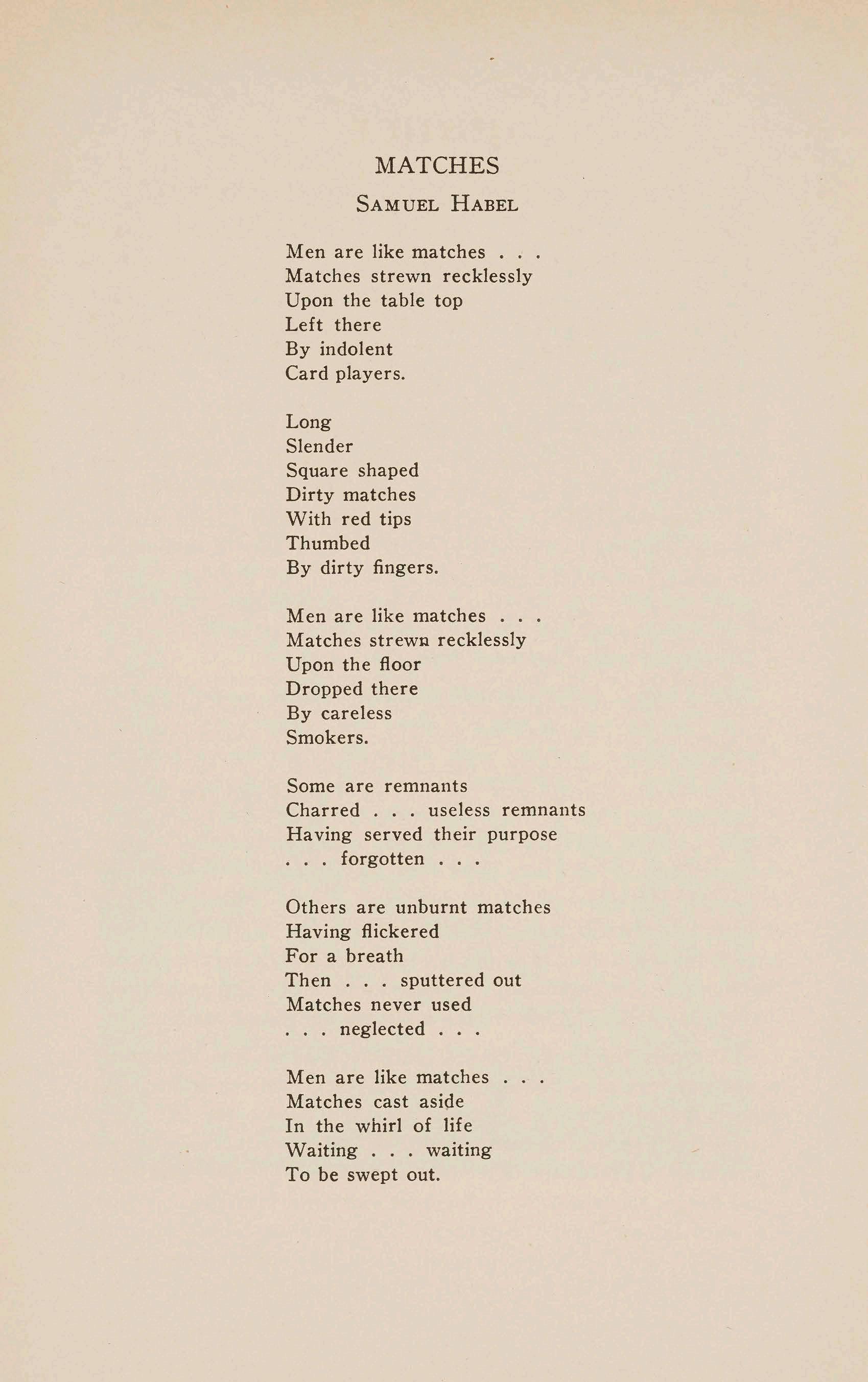 The present writer is poorly equipped for the job at hand. In the first place, he finds writing a laborious, if not painful, business. In the second place, he is lazy. In the third place, it is Spring. . . . It is Spring, messieurs et mesdames, and in all the tree-tops little birds chirp merrily . In the soft waters of the lake, slender, toothsome water nymphs ("enticing water nymphs" to quote a certain, penetrating person in authority) disport themselves joyously (eke enticingly, be it admitted) so that one is forced to conclude that it would be far more interesting, far nicer, far more delightful, to live poetry than to read poetry.