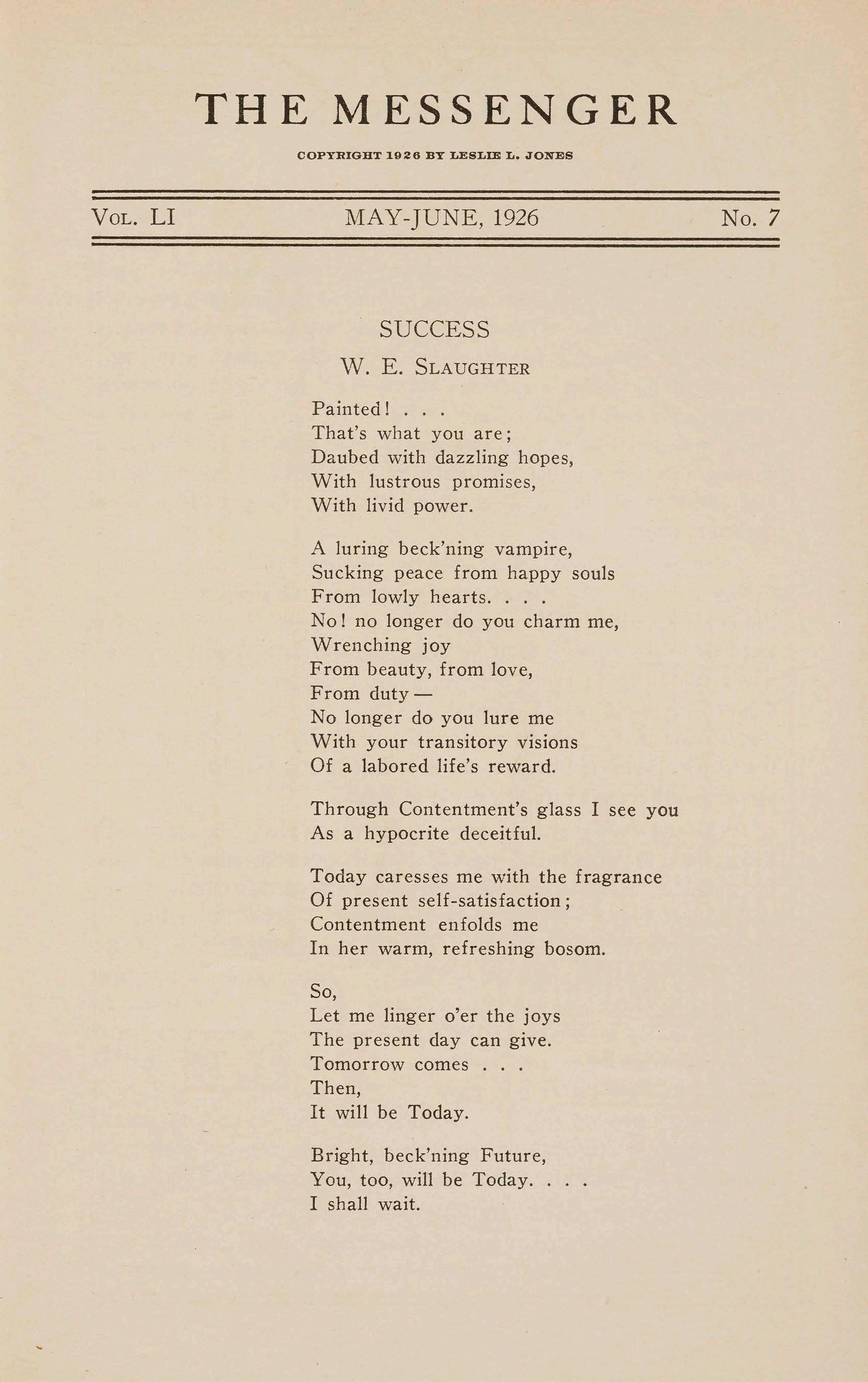 journal. And they have not. In the April, 1925, number we threatened, if opuses were not forthcoming, to utilize a trunk load of our own stuff. We have not hesitated to execute this dire threat, and several issues have been stoutly buttressed in this high-handed manner. But THE MESSENGERhas gone to press on time .... Today, just fourteen months later, and while the presses wait for this last bit of copy, no less than twenty-five or thirty manuscripts addressed to their authors ( each containing a politely worded rejection slip) lie on our desk in THE MESSENGERoffice. A great deal of this is good material, and up to the usual college magazine standard. But there are limitations to space, and our present difficulty becomes one of selection. Not even one of our own opuses appears in this issue. Old "Dearth" seems to be definitely routed.