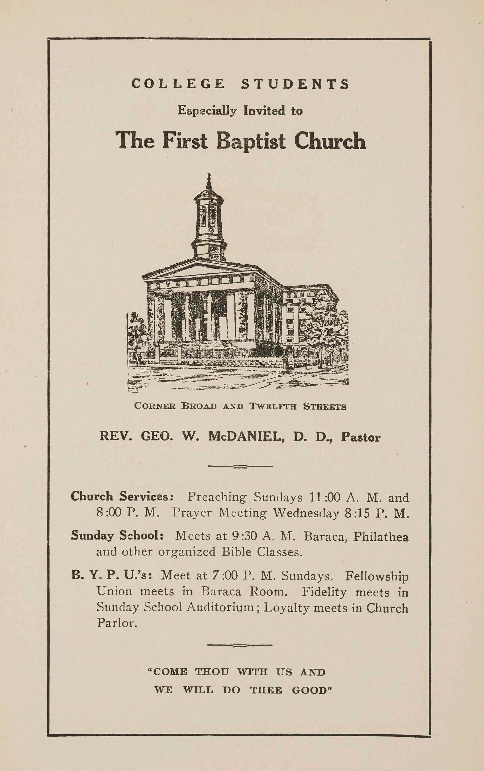 B. Y. P. U.'s: Meet at 7 :00 P. M. Sundays. Fellowship Union meets in Baraca Room. Fidelity meets in Sunday School Auditorium; Loyalty meets in Church Parlor.