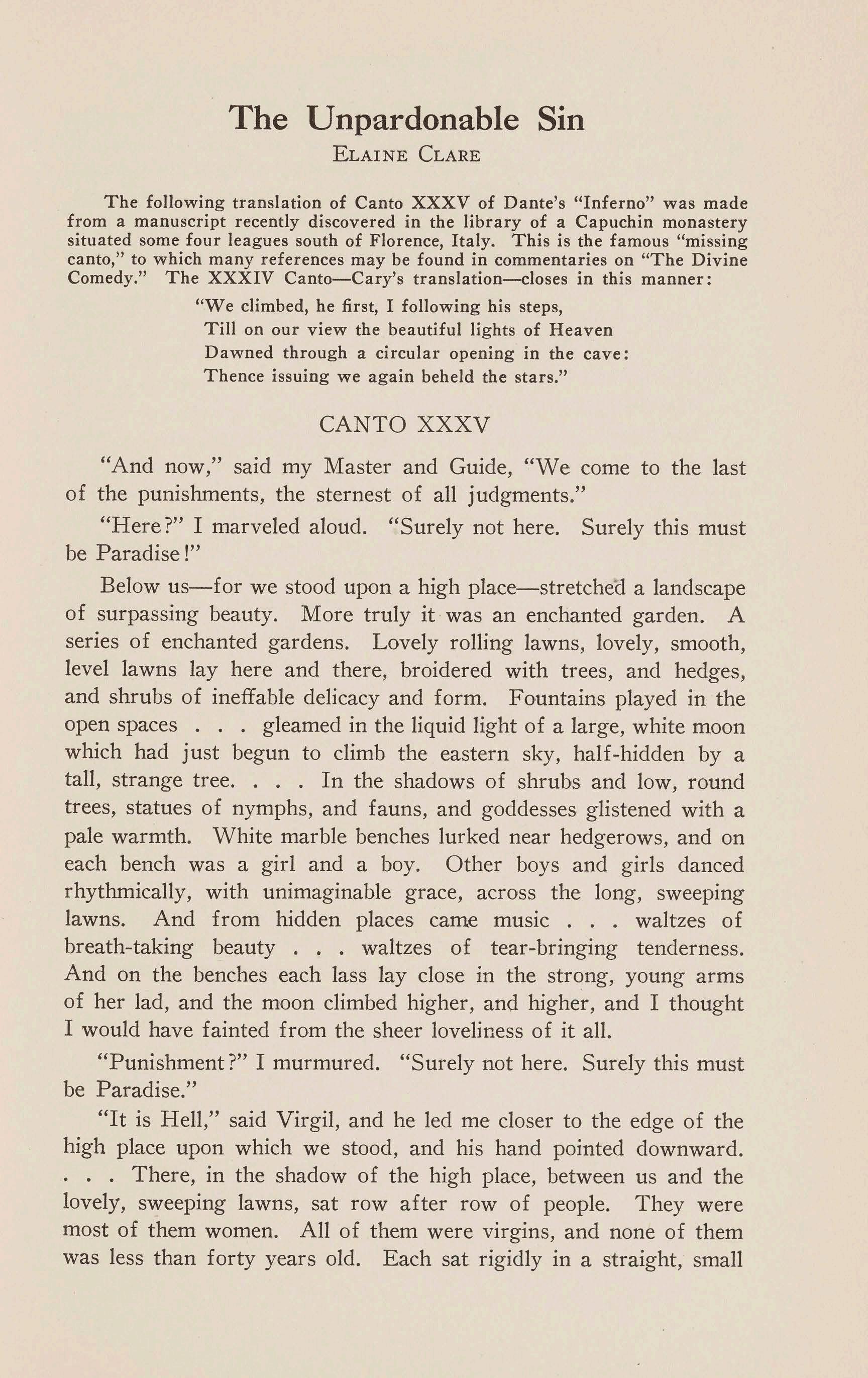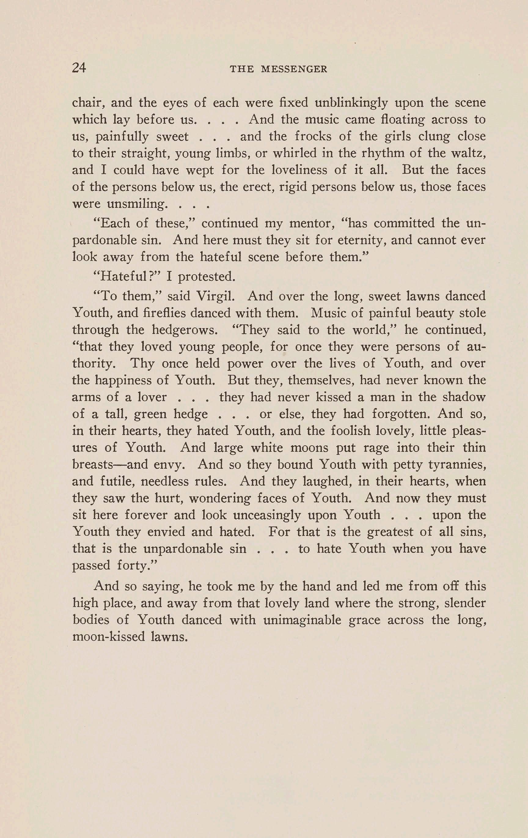 And so saying, he took me by the hand and led me from off this high place, and away from that lovely land where the strong, slender bodies of Youth danced with unimaginable grace across the long, moon-kissed lawns.