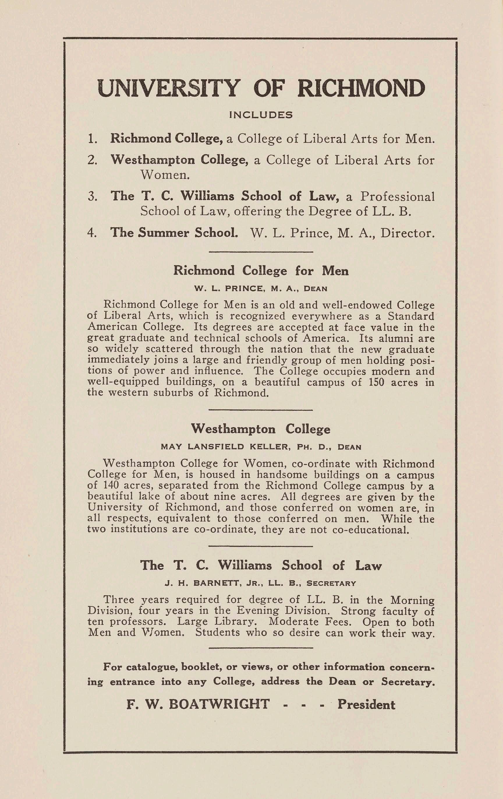 Richmond College for Men is an old and well-endowed College of Liberal Arts, which is recognized everywhere as a Standard American College. Its degrees are accepted at face value in the great graduate and technical schools of America. Its alumni are so widely scattered through the nation that the new graduate immediately joins a large and friendly group of men holding positions of power and influence. The College occupies modern and well-equipped buildings, on a beautiful campus of 150 acres in the western suburbs of Richmond.
